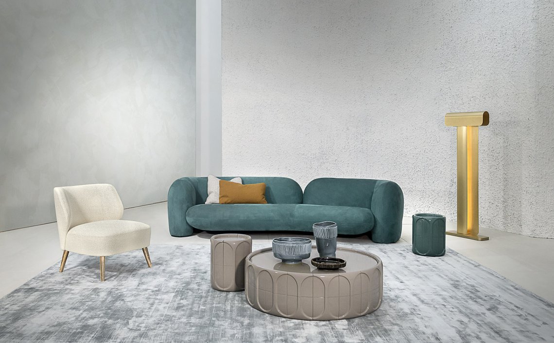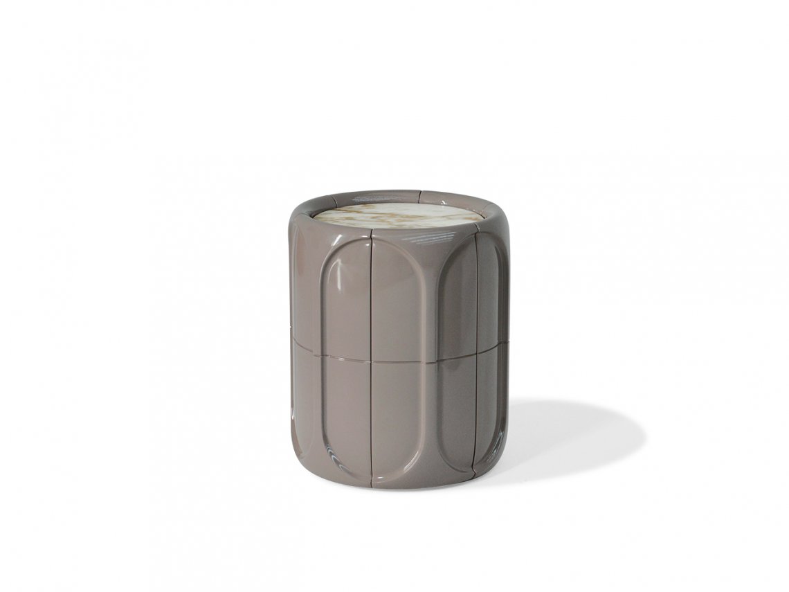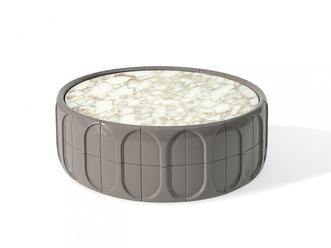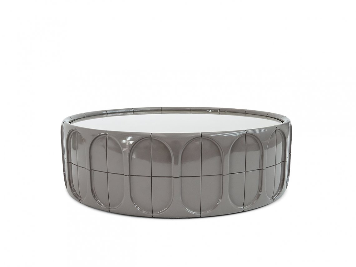 Concave coffee table enriches the living area with a sculptural touch and is characterized by a round shape embellished on the surface by many three-dimensional facets. It is available in various colours with a glossy or matt finish.