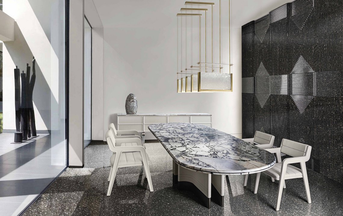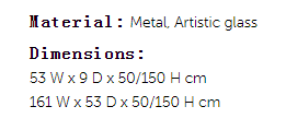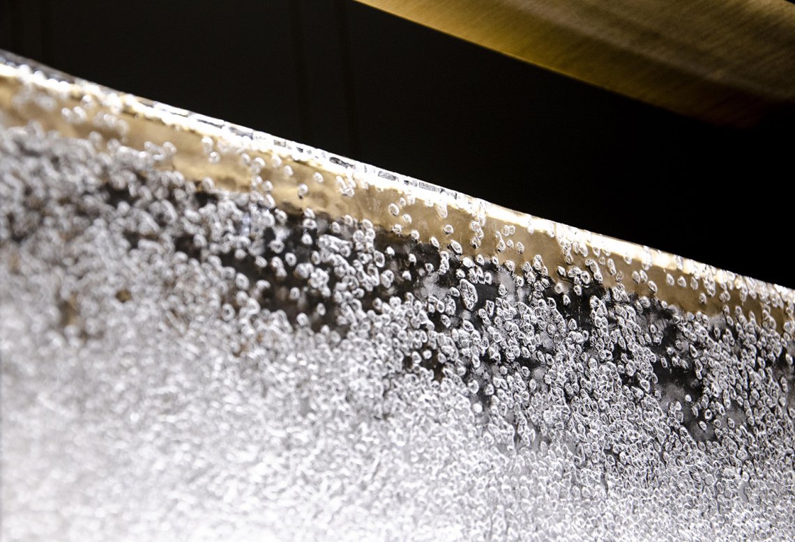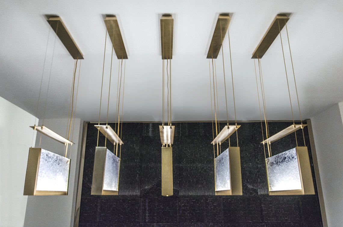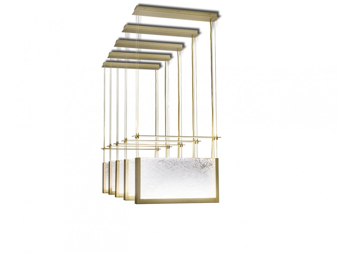 Chandelier Shade, able to value the beauty of rectangular tables in dining areas, is composed by five hanging elements. Each element presents a brushed metal frame that envelops two handmade small glass slabs created by master glassmakers through the casting-in-plates technique and each one is decorated with grains that blend on one side. The refinement of this item is enhanced by the light included in each element.