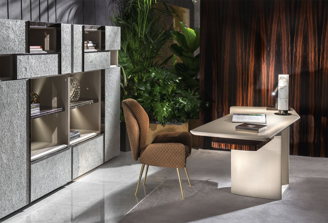 Eclipse writing desk expresses great harmony thanks to its refined lines. The structure presents an unusal design in terms of construction and materials used: two elliptical legs upholstered with leather support an upholstered elegant top while, on the sides of the structure are assembled one shelf on the right and a drawer on the left in ebony wood. Marble table lamp Yale matches really well with this writing desk.