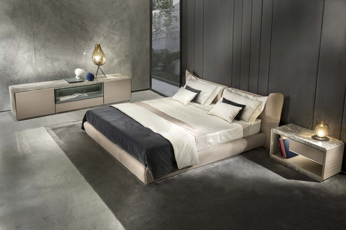 Laryssa bed has a headboard defined by two panels with sinuous lines, where elegant handmade tailoring stitching runs along its perimeter. Available only with leather upholstery.