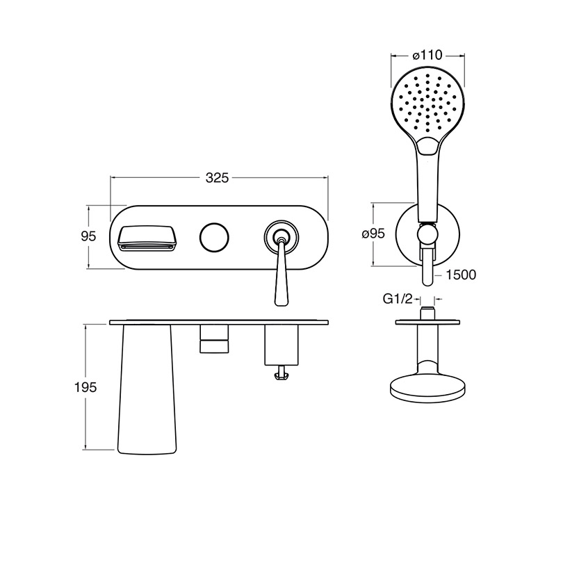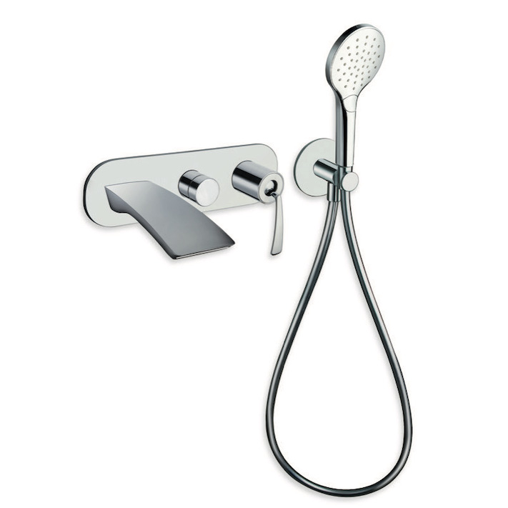 Single-control wall-mounted external set for shower/bathtub, metal plate, with mechanical mixing, diverter with 3 outlets. Spout length 195 mm, anti-scale mini showerhead with adjustable jet, fixed support, water outlet and long-life hose ****. “Waterfall