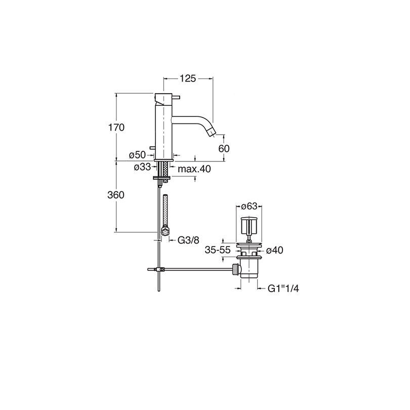 Single-control single-hole deck-mounted Regular Washbasin mixer, with mechanical mixing and pop-up waste 1" 1/4
