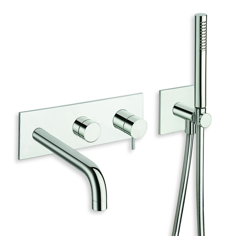 Single-control wall-mounted external set for bathtub, metal plate, with mechanical mixing, diverter with 2 outlets, spout length 230 mm, fixed support, water outlet, anti-scale mini showerhead and long-life hose ****. For completion with recessed part CRICS100 (dx) / CRICS101 (sx)
