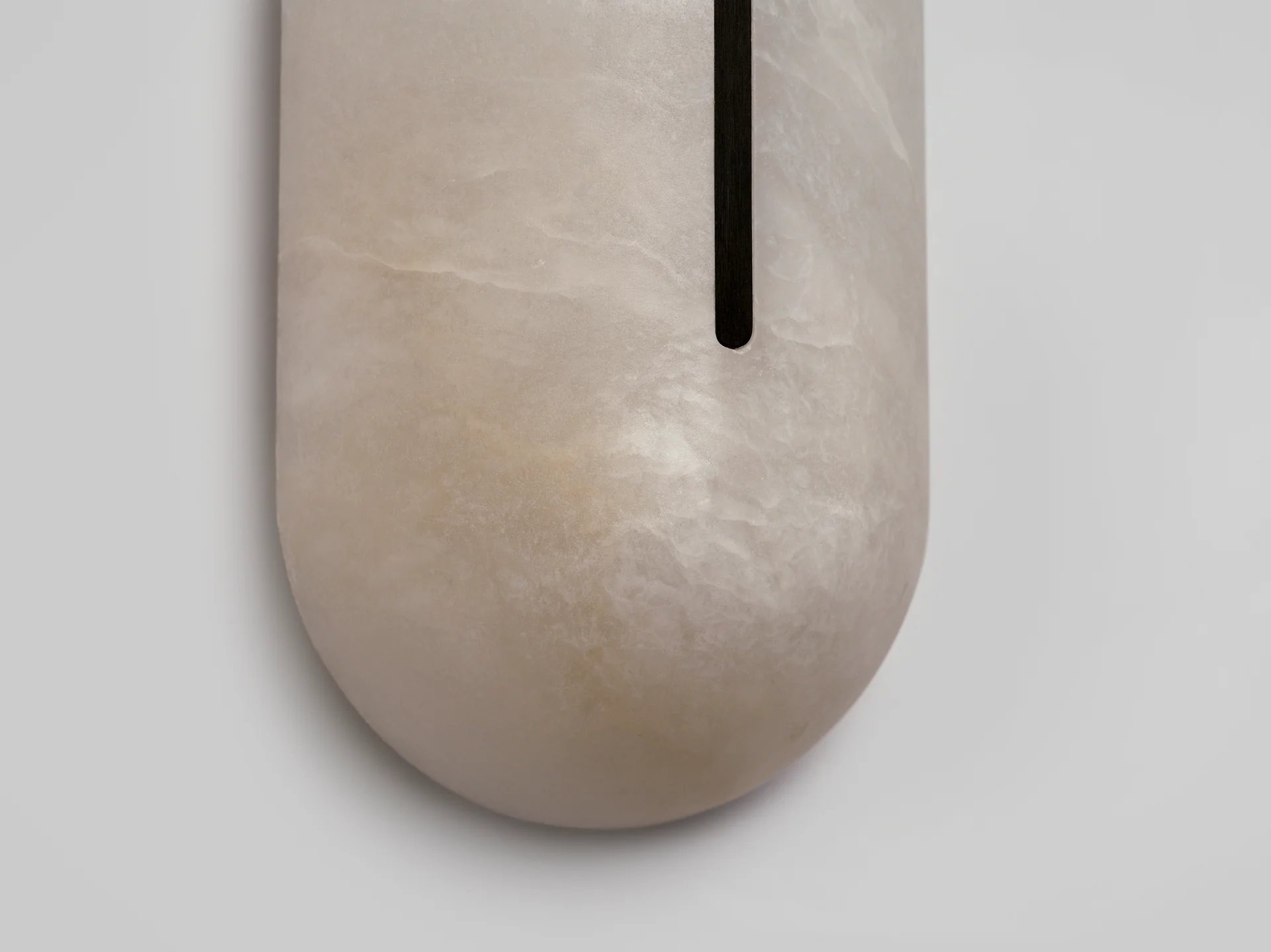 HEPWORTH wall light stands as a luminous testament to the artistic prowess of Dame Barbara Hepworth. Drawing inspiration from Dame Barbara’s iconic sculptures, renowned for their curvaceous, abstract representations of the human form, this light fitting embodies a similar aesthetic. Its elongated shape, punctuated by a delicate central line, mirrors the soft contours that made Hepworth’s work so distinct.