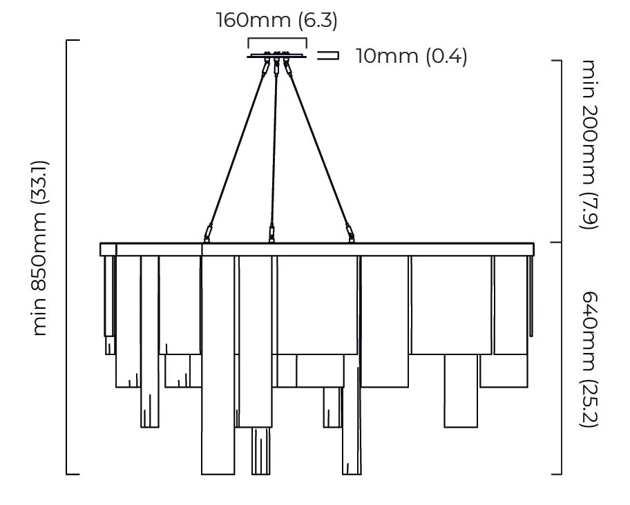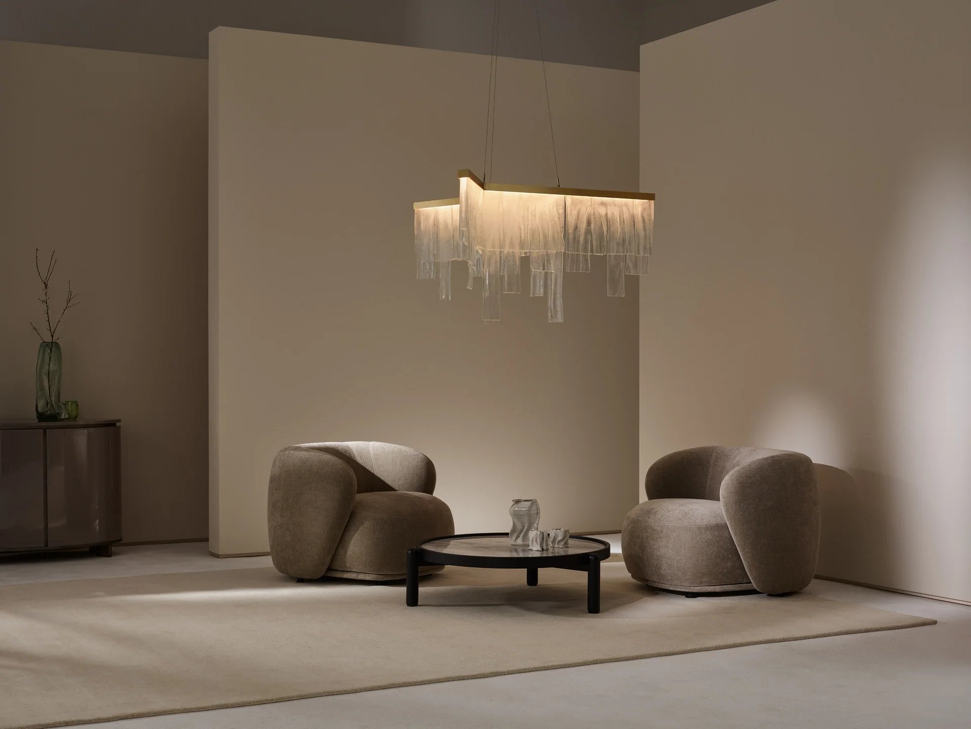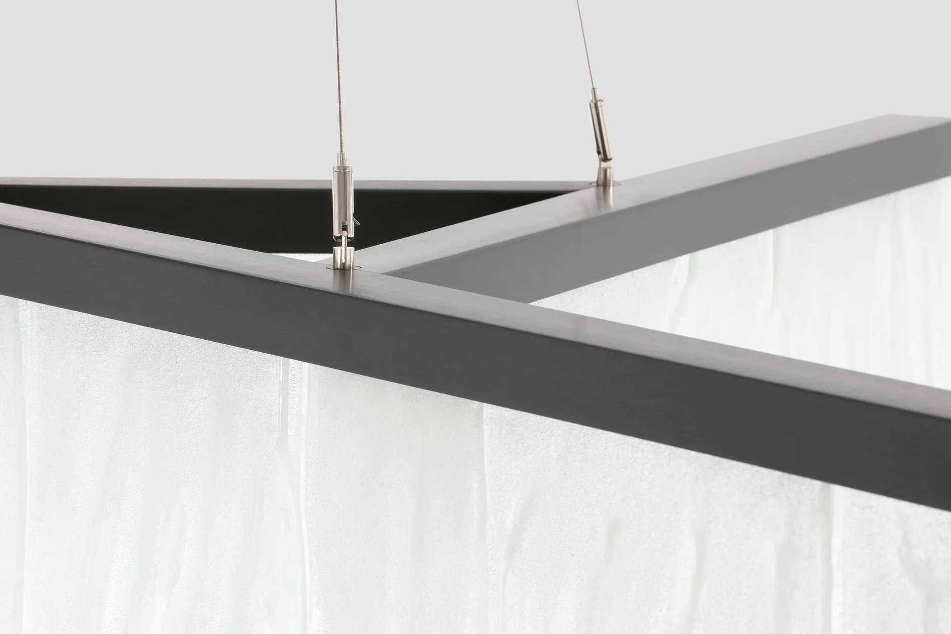 The CASCATA Chandelier, with its fluid glass panels and contrasting triangular frame, is a highly unique, sculptural feature. The sleek metalwork forms a beautiful graphic structure when viewed from above, which is juxtaposed against the artisanal glass panels evocative of deep rivulets and flowing water.