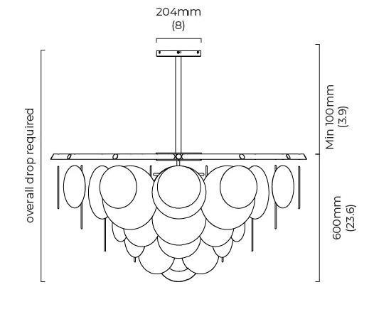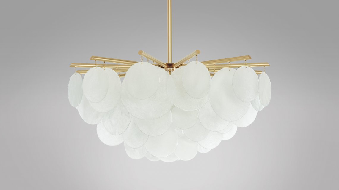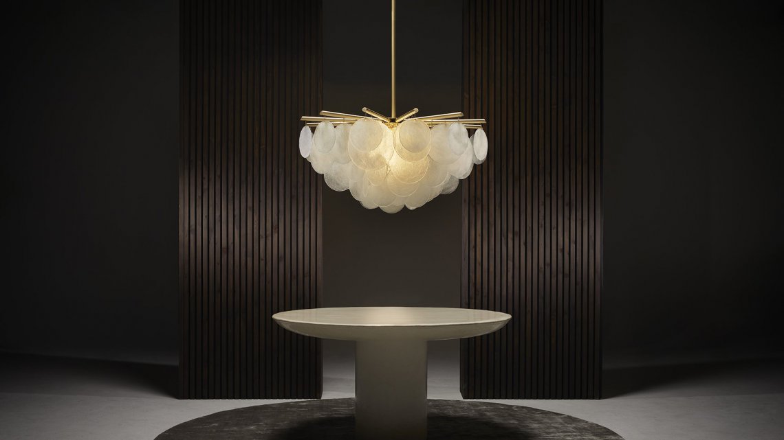 A cloud-like version of the original Nimbus Chandelier with a framework that is circular, where the glass profile has a soft, fully curved silhouette. Each piece of glass is unique. The droplets are hand-formed by our artisans using a process where undulations and crystal-like textures form. The translucent glass is complimented and beautifully framed by the circular metalwork. The light emitted is a warm, soft glow.