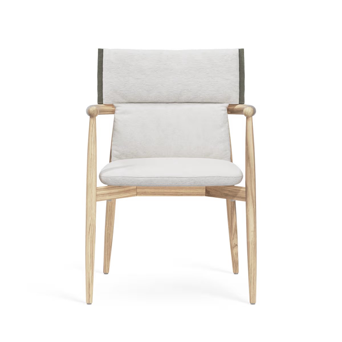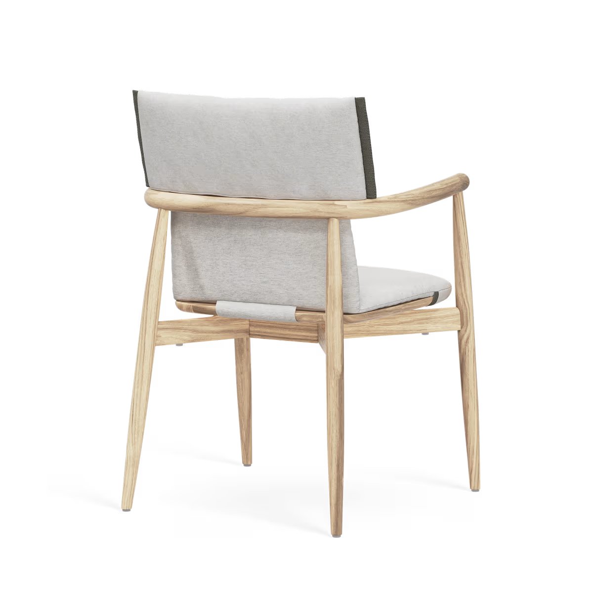 The cushion for the E008 Embrace Outdoor Dining Chair is upholstered in Agora Life textile, a weather-resistant and recycled fabric with webbing details. The padded cushion