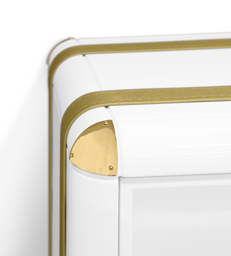 Built in wood, lacquered in glossy white, with details in synthetic leather and gold/silver plated finishes.