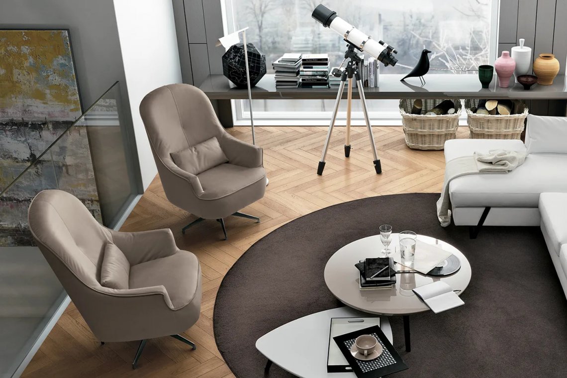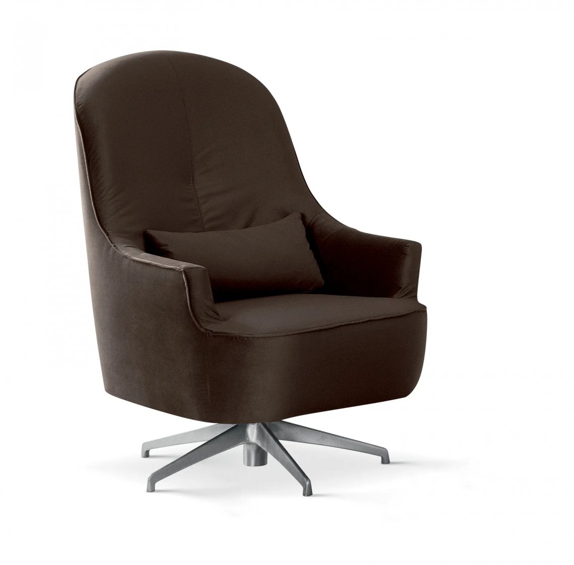 Muna is an armchair with a high back, low armrests and a 5-branch rotating foot. The Structure Design is made even more comfortable by the presence of a small feather pillow, perfect for ensuring good support of the lumbar area. Ideal as a reading chair in a modern or contemporary living room.