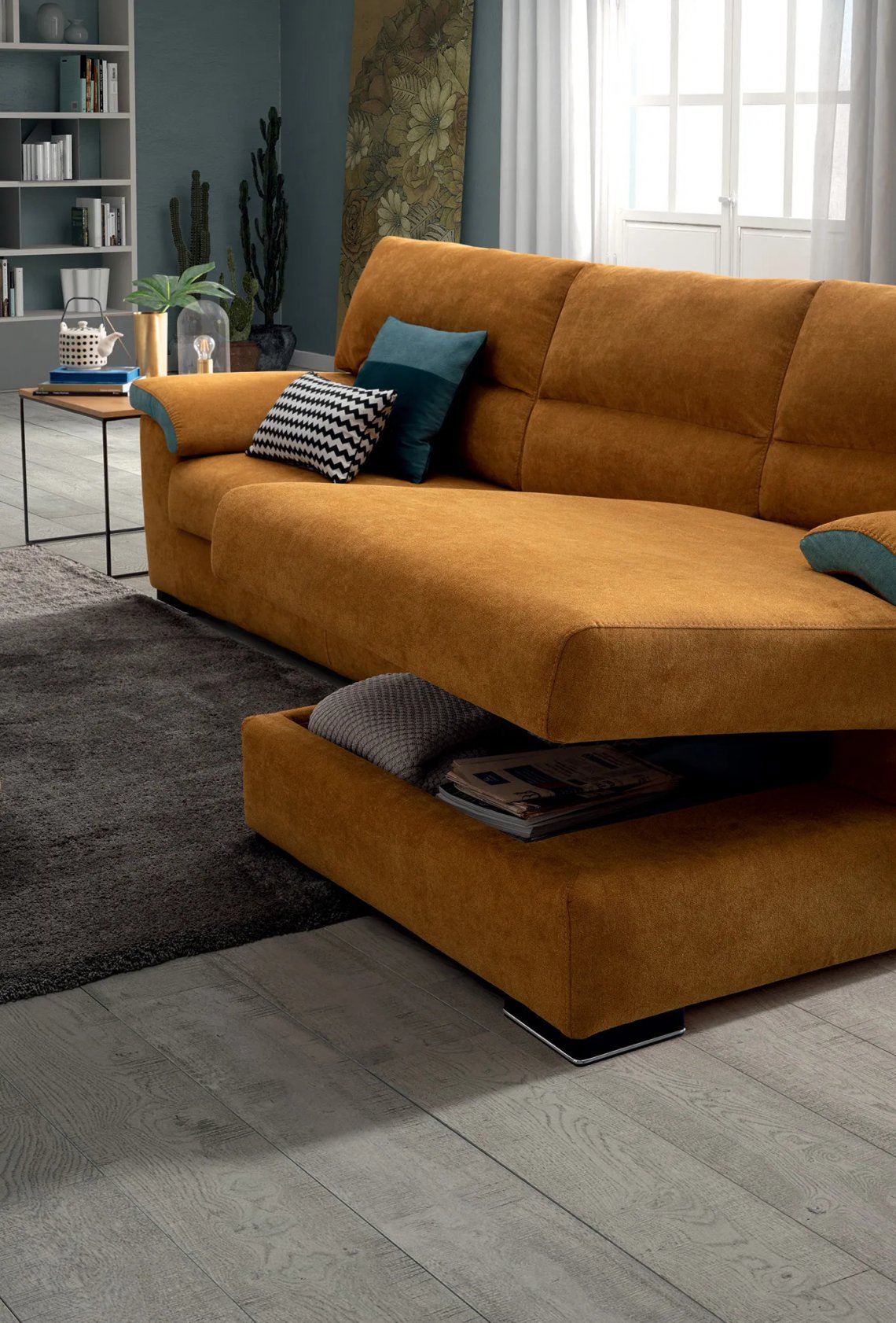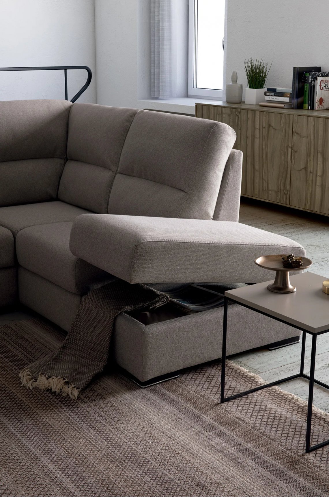 Available in sofa bed version and with storage compartment, an additional replacement cover can be purchased to that selected for its configuration.