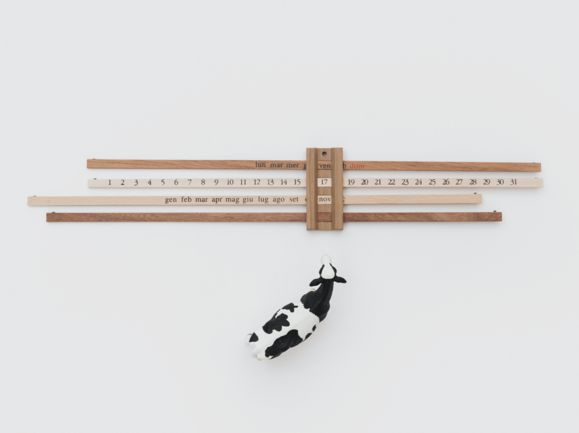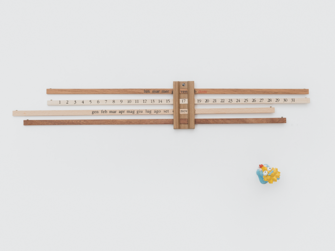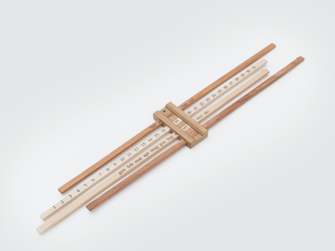 Calendario bilancia is a wall calendar that underlines the passing of time thanks to the human intervention needed to methodically change the date each and every day. It consists of four horizontal strips of different woods printed with either the days of the week, the months or dates. These strips slide through a single central wooden pivot, which frames the date combination. The structure plays on the equilibrium of the thin wooden strips and turns the usual function of a set of scales on its head, turning it into a calendar.