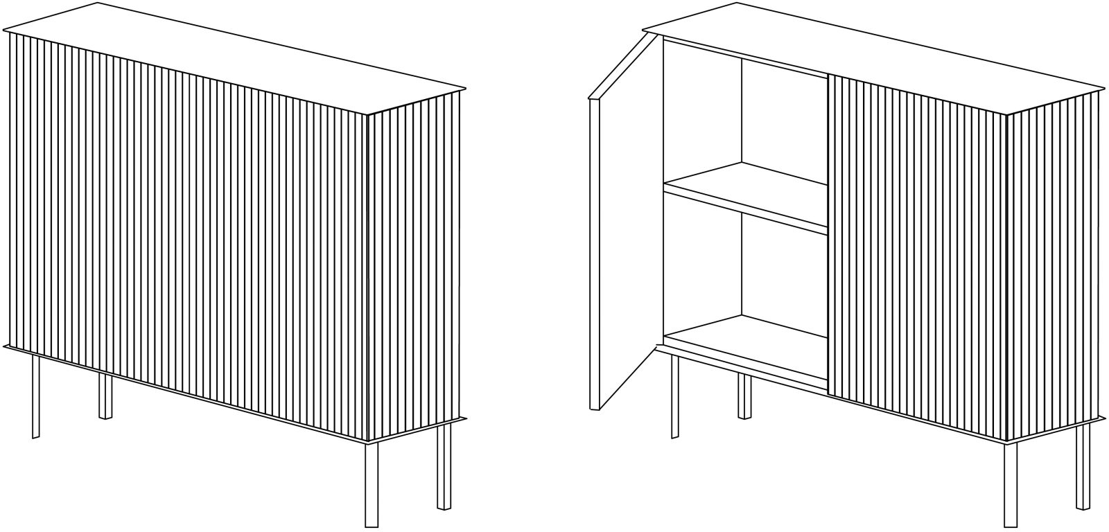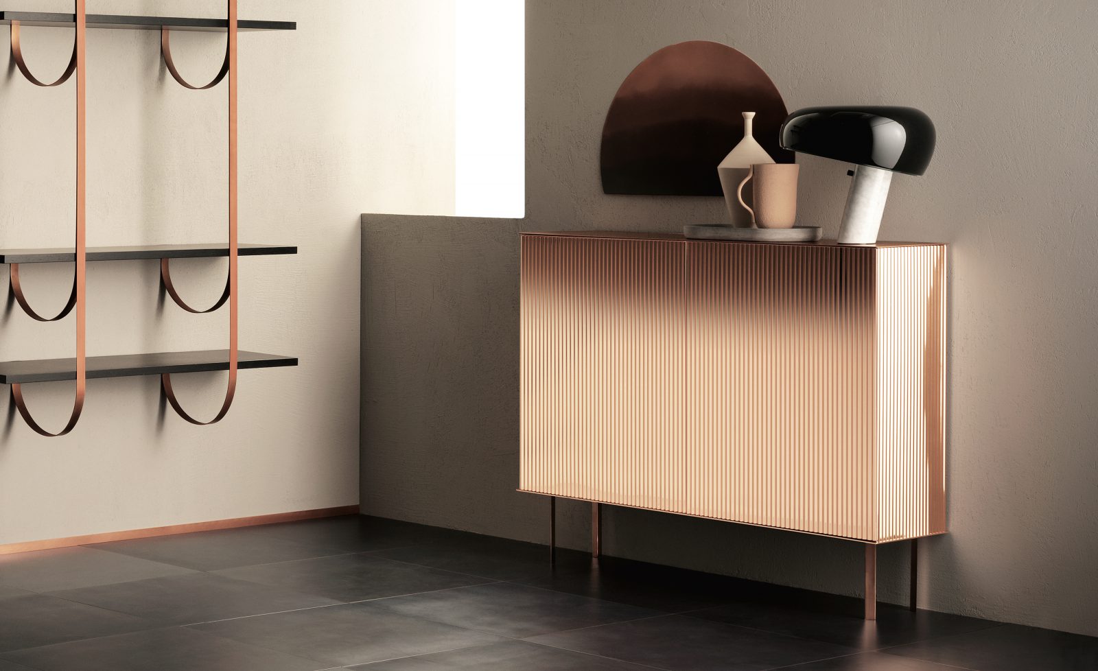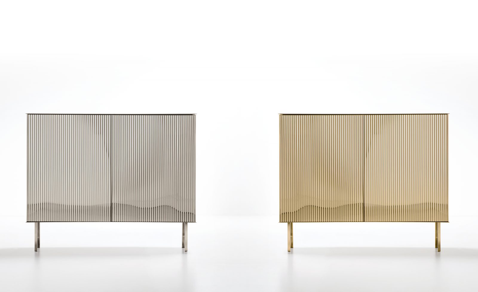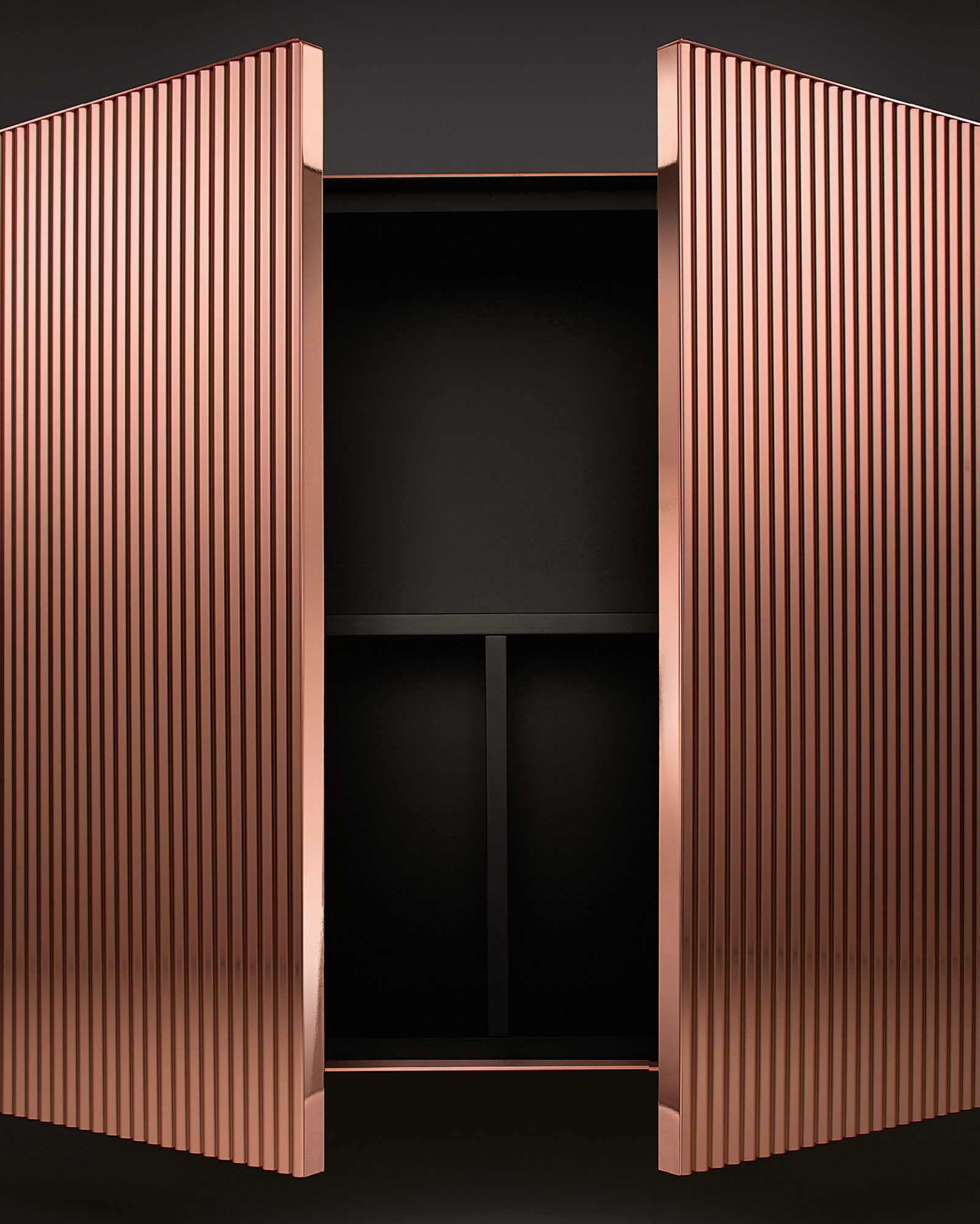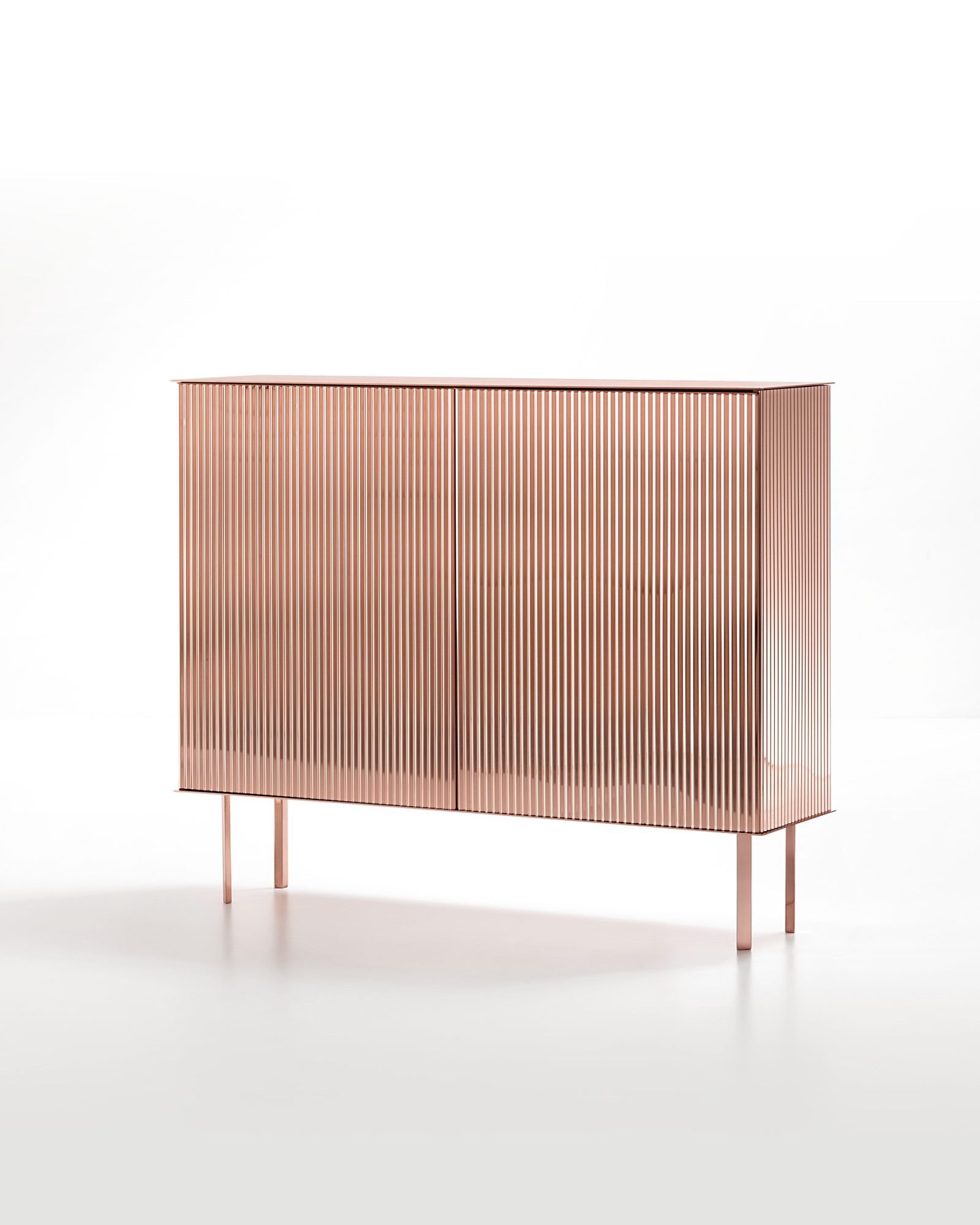 Like a ballerina on her toes, Elizabeth gracefully unfurls her luminous dress, as if made of pleated fabric. The characteristic folds add movement to the metal sheet along the surface of the cabinet, transforming each reflection into light. In an interplay of airiness and tension, elasticity and rigour, the metal vibrates with the rhythm of its pleats. Available in steel, brass or copper, Elizabeth gives shape to a new way of imagining unambiguously feminine metal furniture.