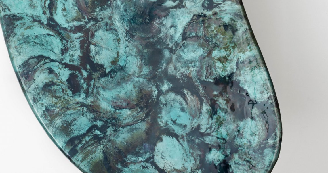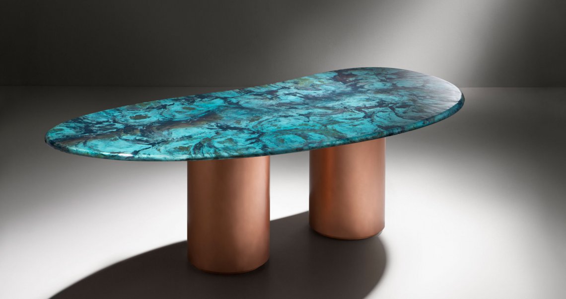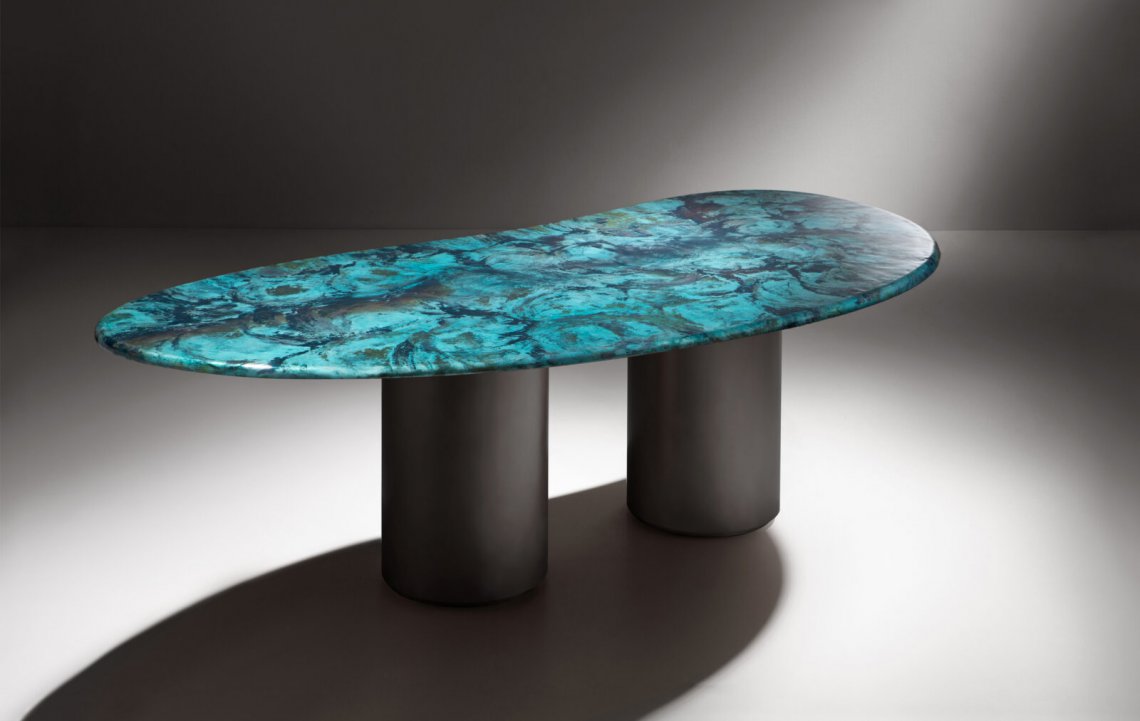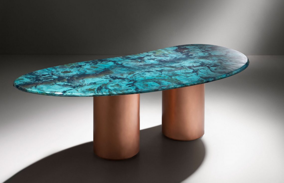 Large table characterized by an organic shape, inspired by the landscapes of the Venetian lagoon sea: the infinite variations given by the waves and the currents come to life in the evocative declinations of the DeNuance lagoon finish, with its many shades of light blue and green.?The base, formed by two cylindrical copper elements, supports the large top with the sinuous line.?The result is a sculptural table, an iconic object that becomes the protagonist of the environment: Baia is almost a piece of art, the power and beauty of nature.