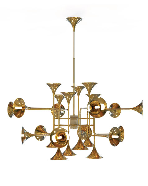 Botti modern chandelier instantly takes us into a music concert starring Chris Botti. The mid-century lighting design was inspired by the American trumpet player as a tribute to jazz music. With a structure handmade in brass and boasting a sophisticated gold-plated finish, this modern ceiling light showcases the high-quality craftsmanship for which DelightFULL is best known for. The brass chandelier goes as tall as 31,5 inches and uses 24 E27 bulbs, which are ingeniously placed at the end of the shades. Its unique shape and design make it the perfect hanging lamp to display on a mid-century modern living room, or a sophisticated hotel lobby.