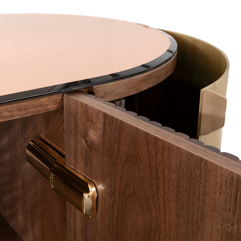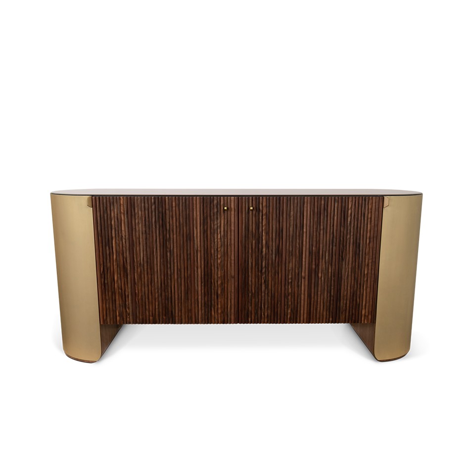 Combining the best of mid-century and Italian design excellence, the Duncan sideboard reinvents the 60s charm in a unique way. The curved lateral metal structures support and hug the body of the side doors, while the main storage space is enhanced with a geometric wooden pattern that adds another layer of texture. High-quality materials and exquisite craftsmanship make this an exceptional statement piece for any modern home design.