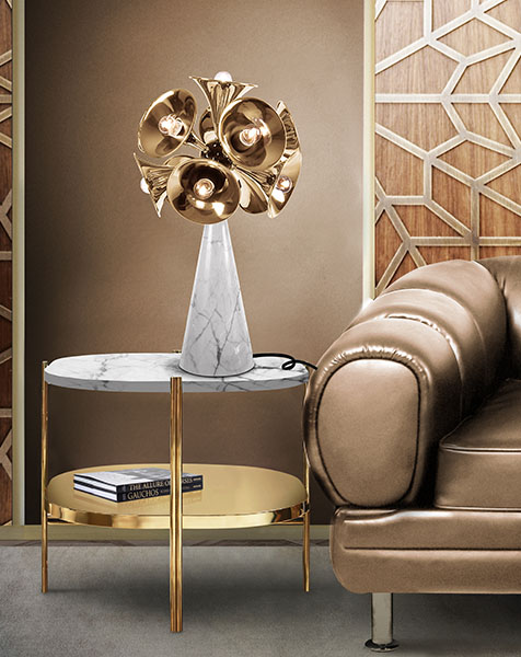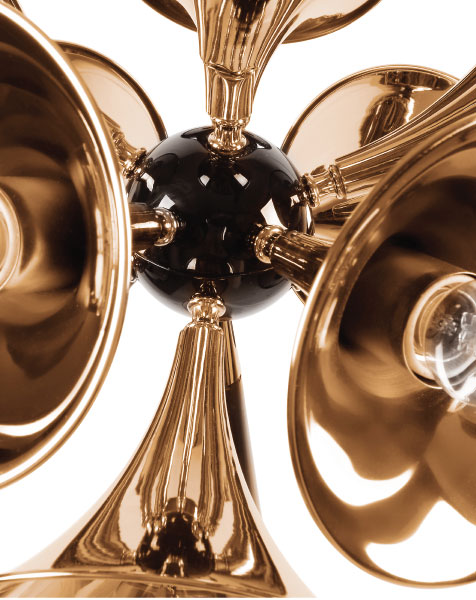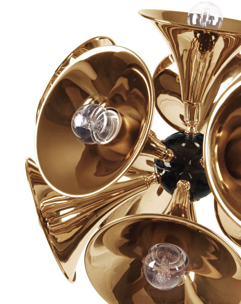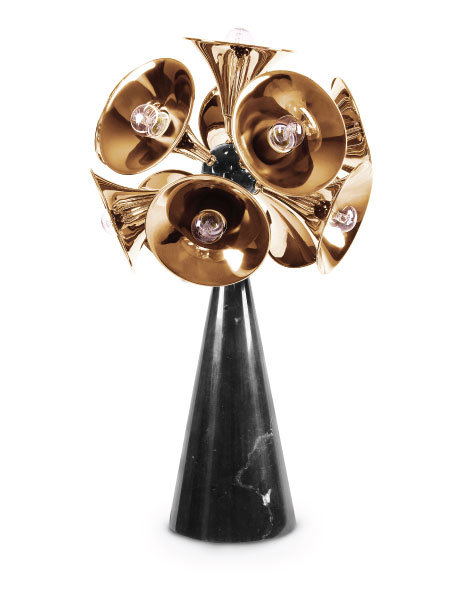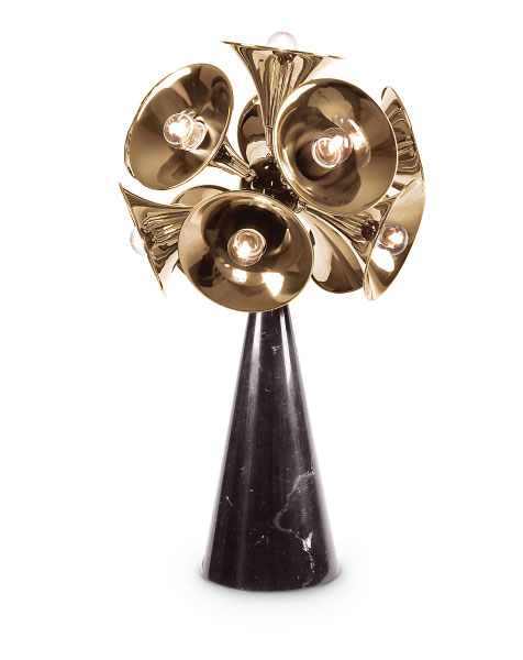The embodiment of the most famous wind instrument of them all, Botti mid-century table lamp was inspired by a classic trumpet. Its unique shades are handmade in brass with a gold-plated finish to resemble a real trumpet. The base can be produced in Nero Marquina or white marble, as well as black nickel or any other finish of your choosing. It is a tall table lamp, very hard to miss, with almost 55 pounds, making it the ideal choice for a classic living room design. This vintage brass table lamp will definitely make a statement in your luxurious home.