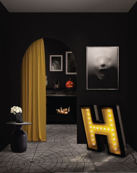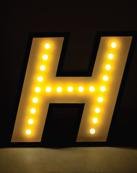 H stands for handmade and for one of the most beloved typefaces hits of this collection. Modern and energetic, this letter draws attention by its standard finishes in italic, with a yellow color and black outline. Made of shiny stainless steel and shining with 17 bulbs, this marquee letter design is available for colour customization and in a mini version! And its also able to put into your floor or your sleek wall. Made only for your interiors.