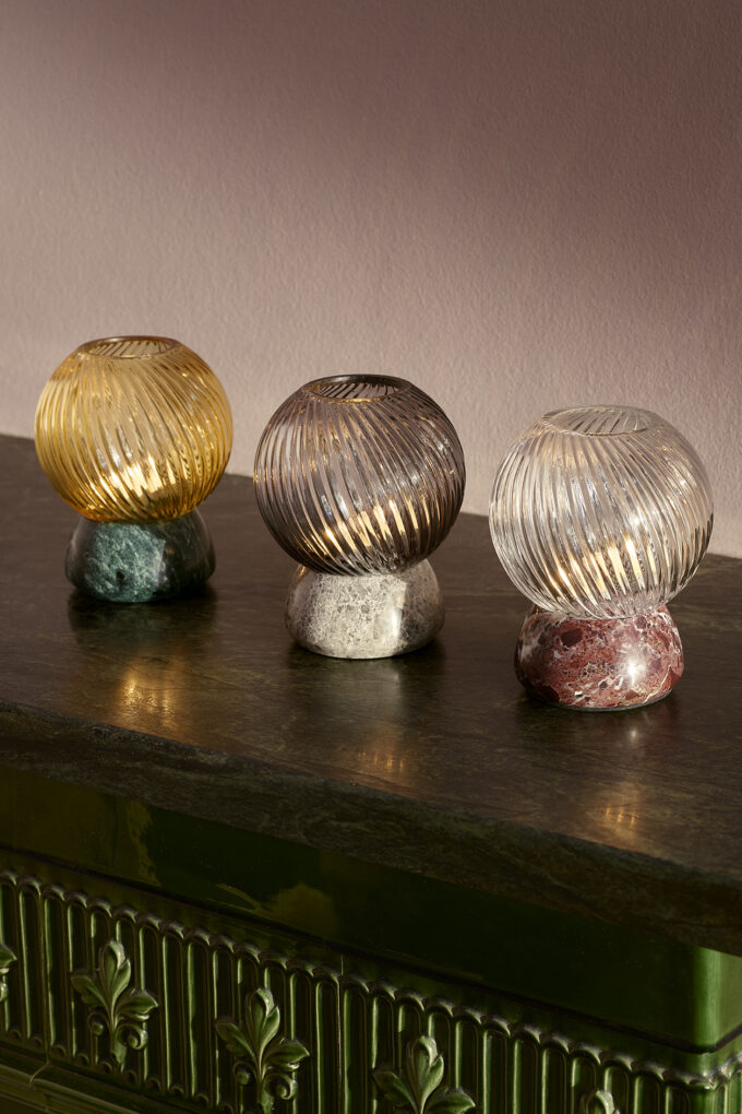 Twist of Marble is a series of candleholders. A classic fusion of marble and twisted glass defines this small hurricane. With its rounded form, it brings a cozy and stylish vibe to any location where you choose to place it.