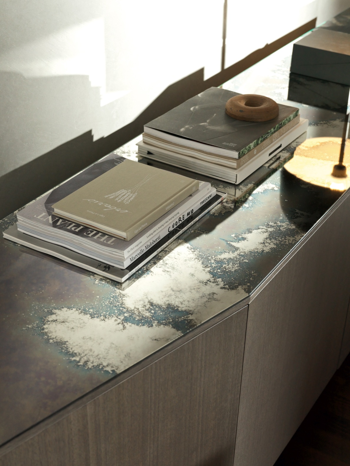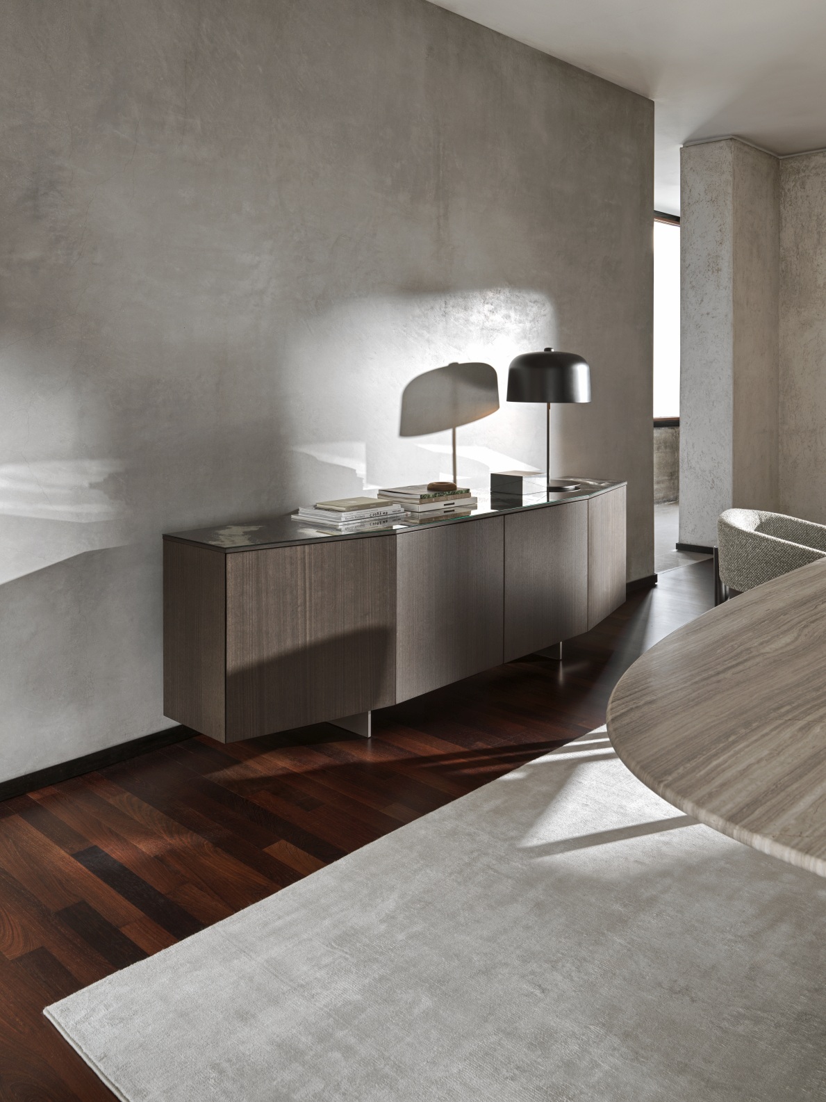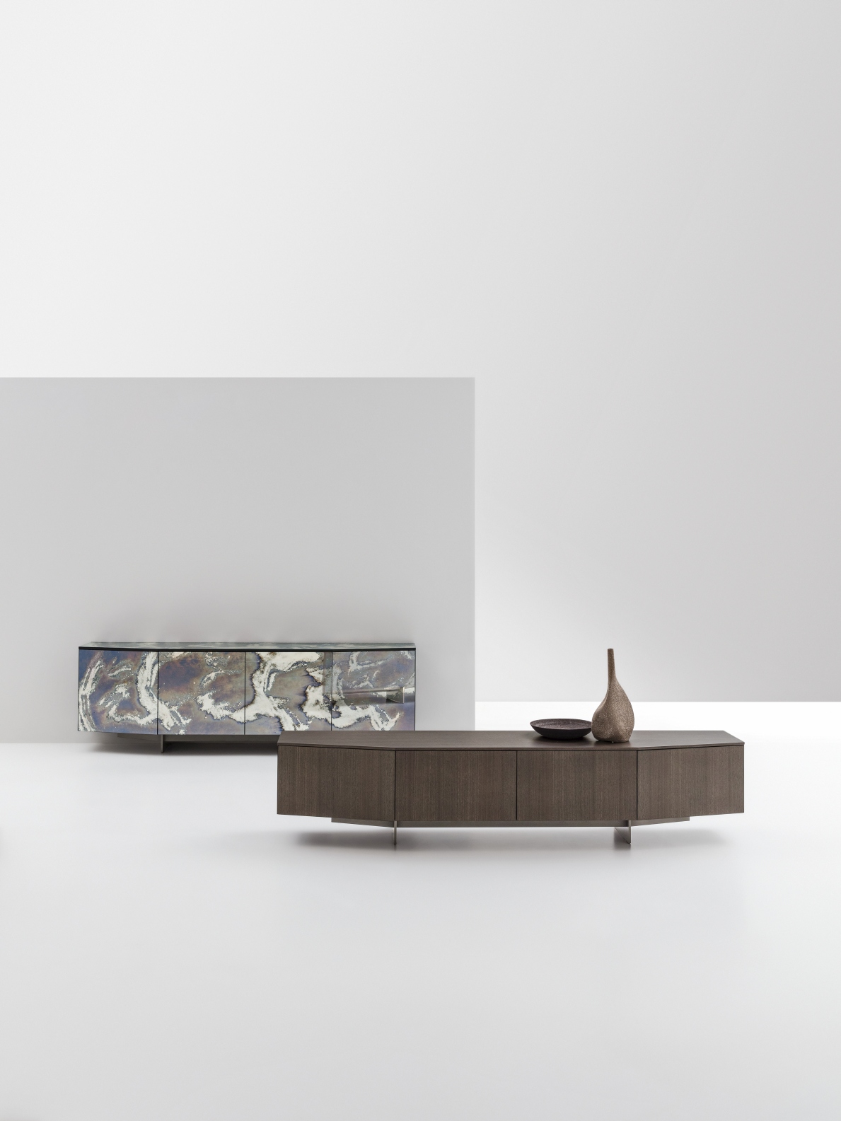 Una piccola architettura si fa protagonista nello spazio domestico. Dalla forma scultorea, in versione alta oppure bassa, Angle è una madia caratterizzata da un disegno rastremato e da una profondità ridotta. Può essere personalizzata nei materiali e nelle finiture tra fusto, scocca, top e ante.