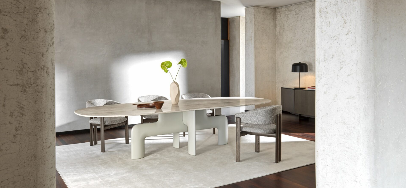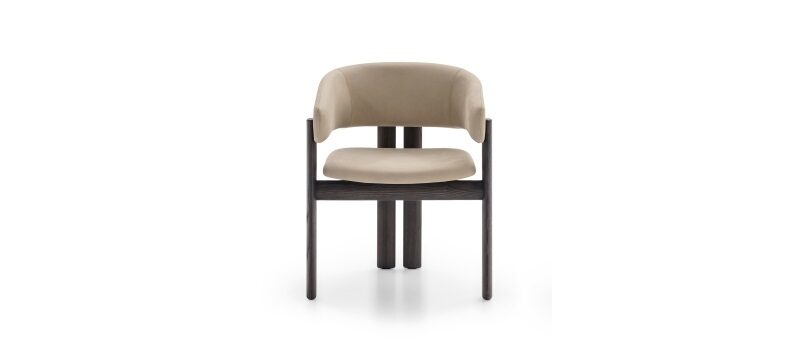 Attractive and refined shapes give rise to a composition comprising a table – in various sizes – and a chair – covered with leather or fabric. An original and concurrently classic look for the set, like an urban landscape which harmoniously brings together different souls.