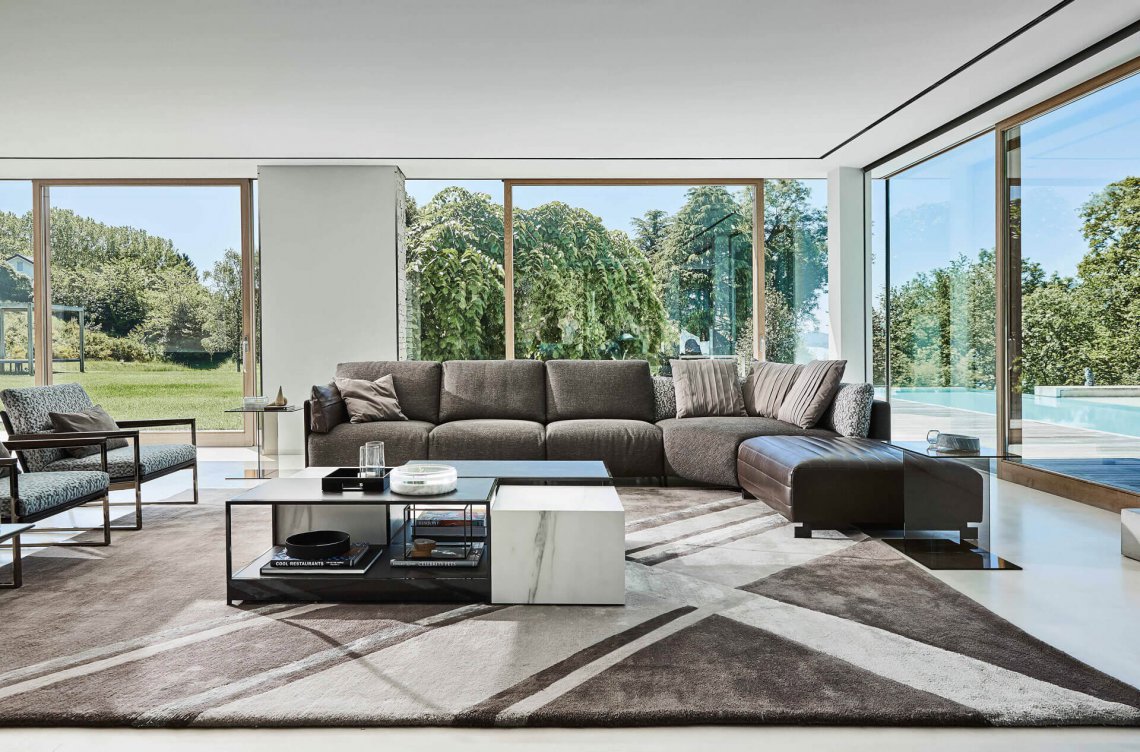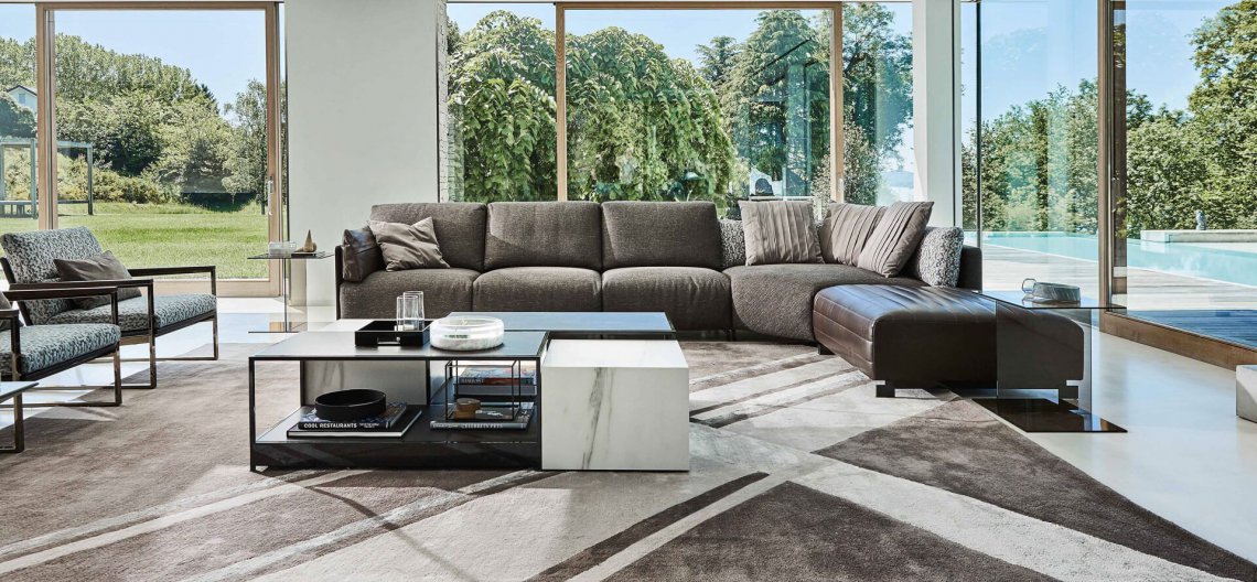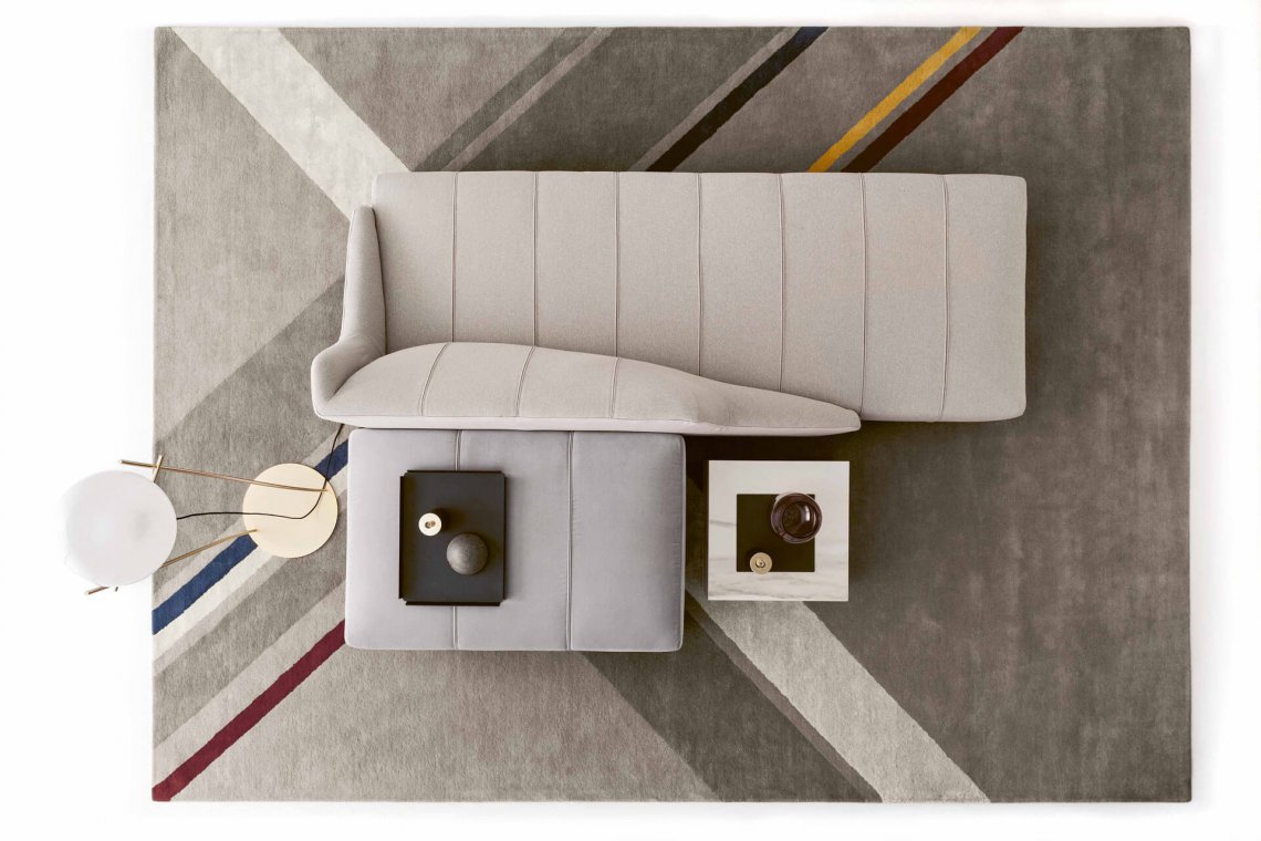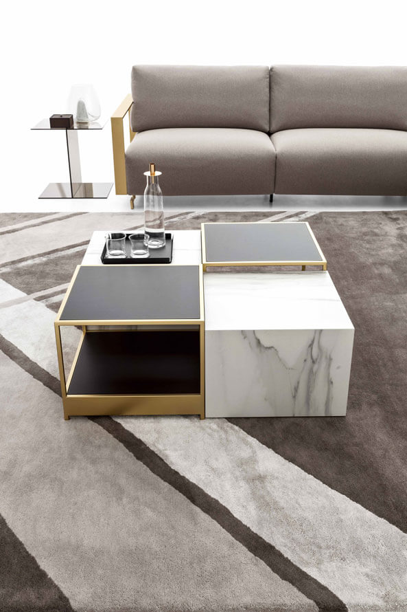 Bag si completa con una serie di tavolini, e cubi in stone-gres che si registrano con le modularità dei componenti imbottiti.