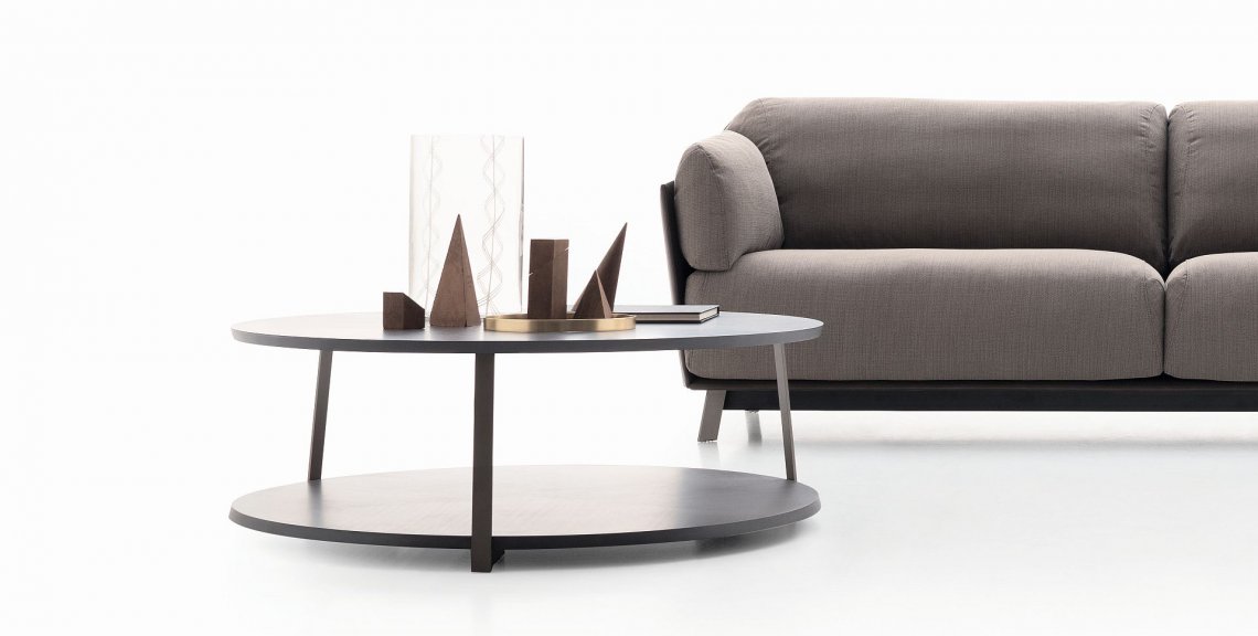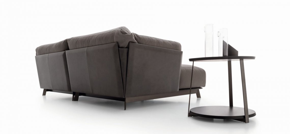 profilo smussato e con colorazione marrone o grigio cenere. La panca con outline asimmetrico diventa un piano sovrapponibile agli elementi imbottiti ed un utile accessorio portariviste e miniscrittoio.