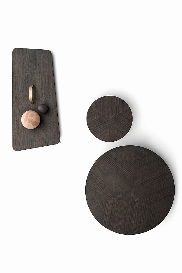 Una struttura esile ma robusta sviluppa una serie di tavolini tondi con top singoli o a doppia altezza. I piani sono realizzati in eucalipto con