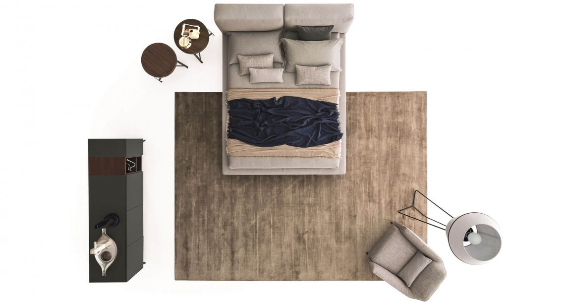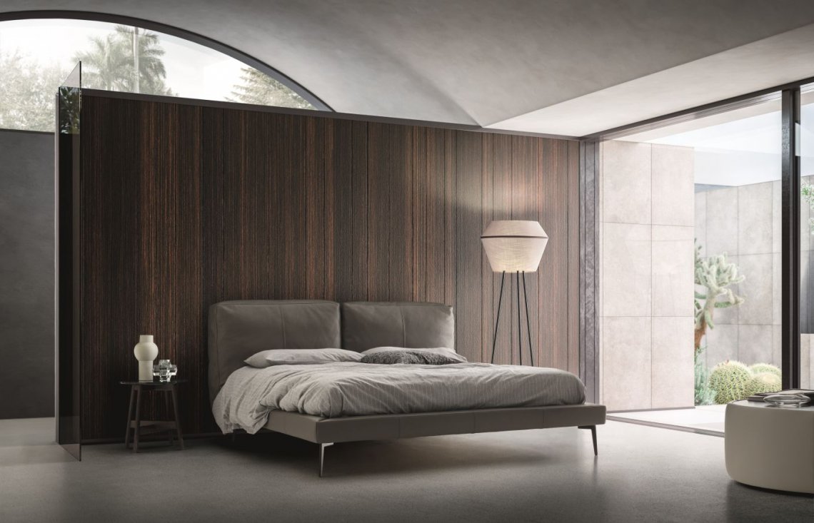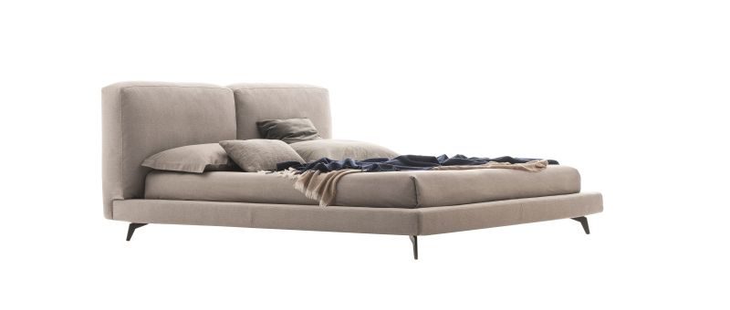 Così come la corposità della testiera imbottita, vive armonicamente con una struttura più esile sostenuta dai piedini in metallo nelle quattro finiture: cromo, bianco, grigio e marrone.