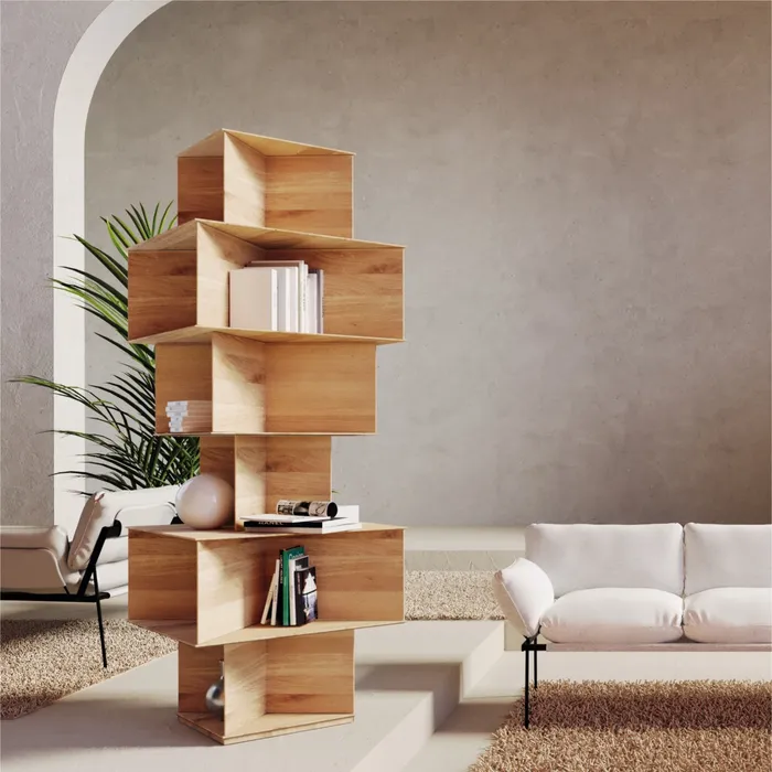 Presenza scenica da icona che riesce a supportare una multifunzionalità al tempo stesso irriverente e concreta. Totem Shelf è una libreria autoportante costituita da una serie di volumi impilati. Ogni volume è diviso diagonalmente in quarti, creando piccoli telai o diorami per oggetti personali. Un luogo magico e aperto dove collezionare le proprie manie perpetue ed abitudini quotidiane.