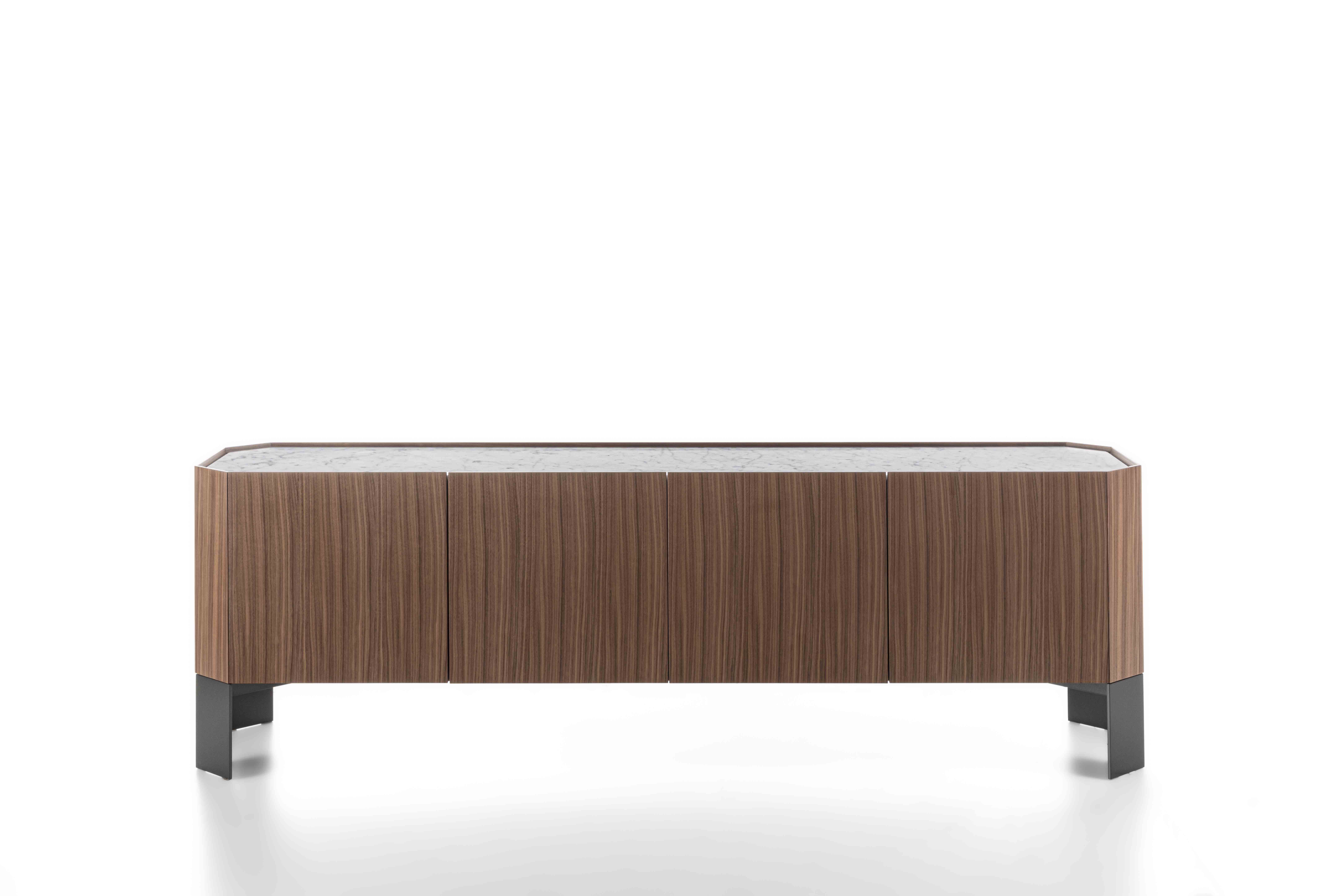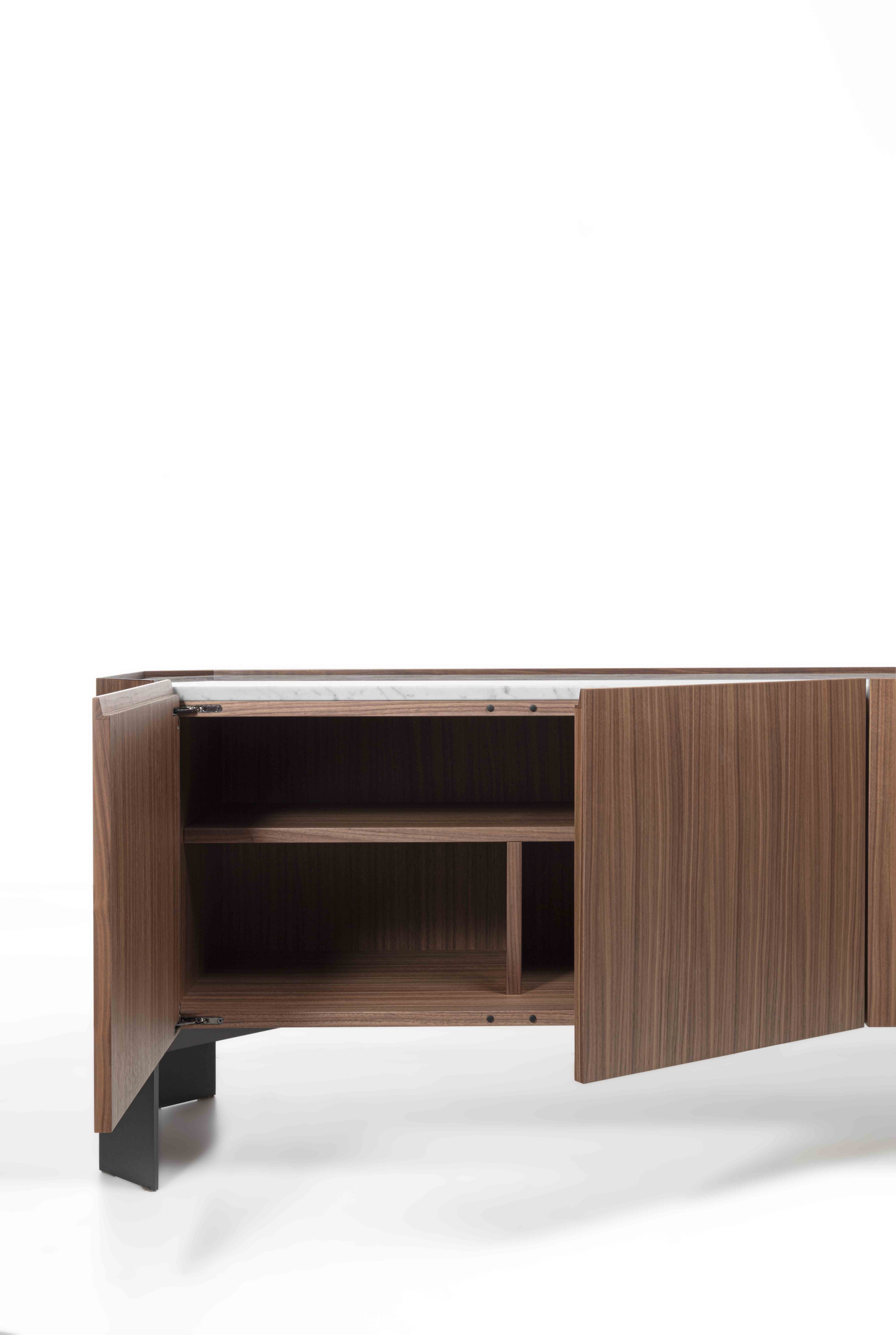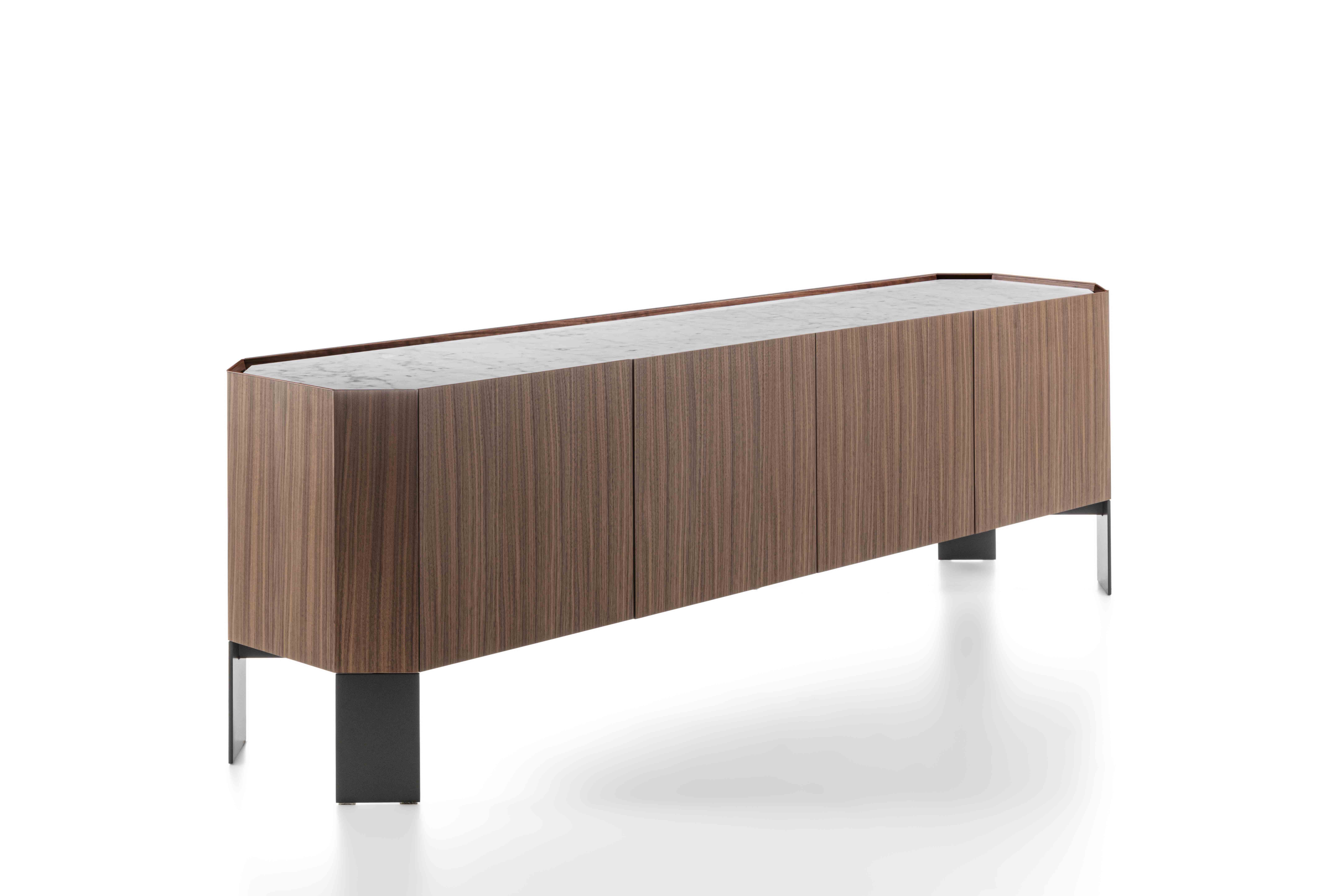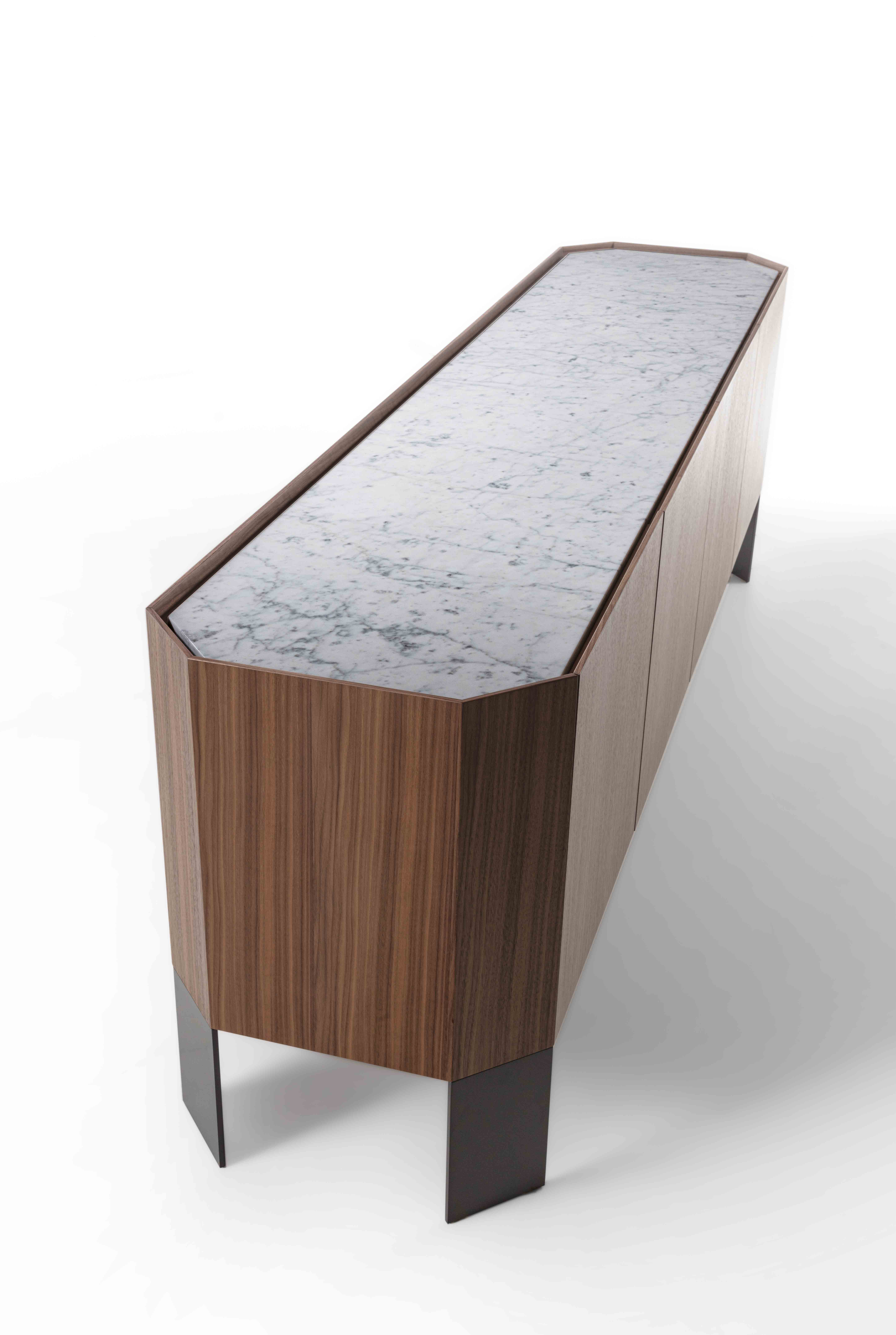 Storage unit with three/four wooden doors and marble or wooden top. The base is in metal and the internal division is characterized by wooden shelves.