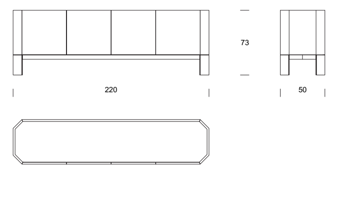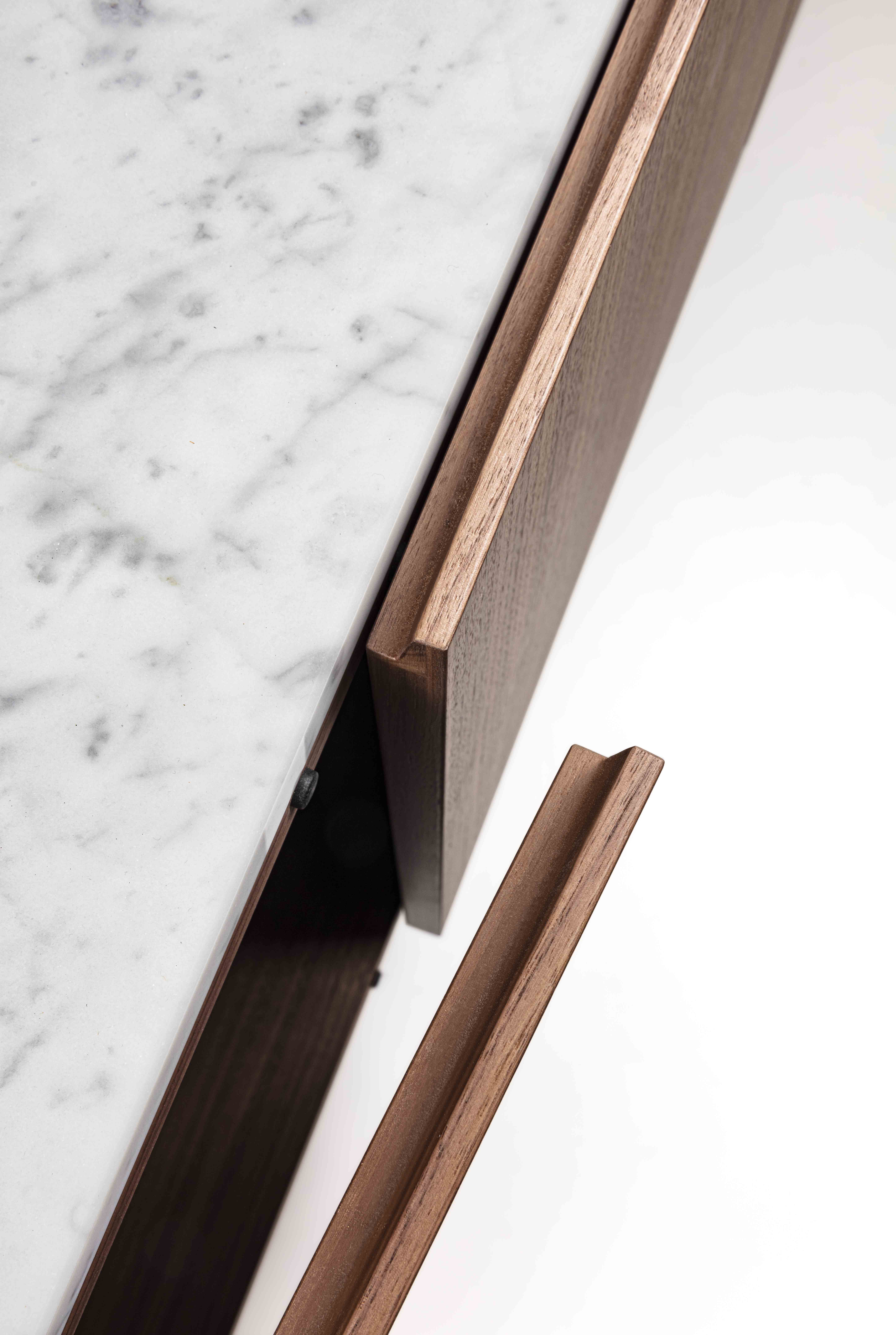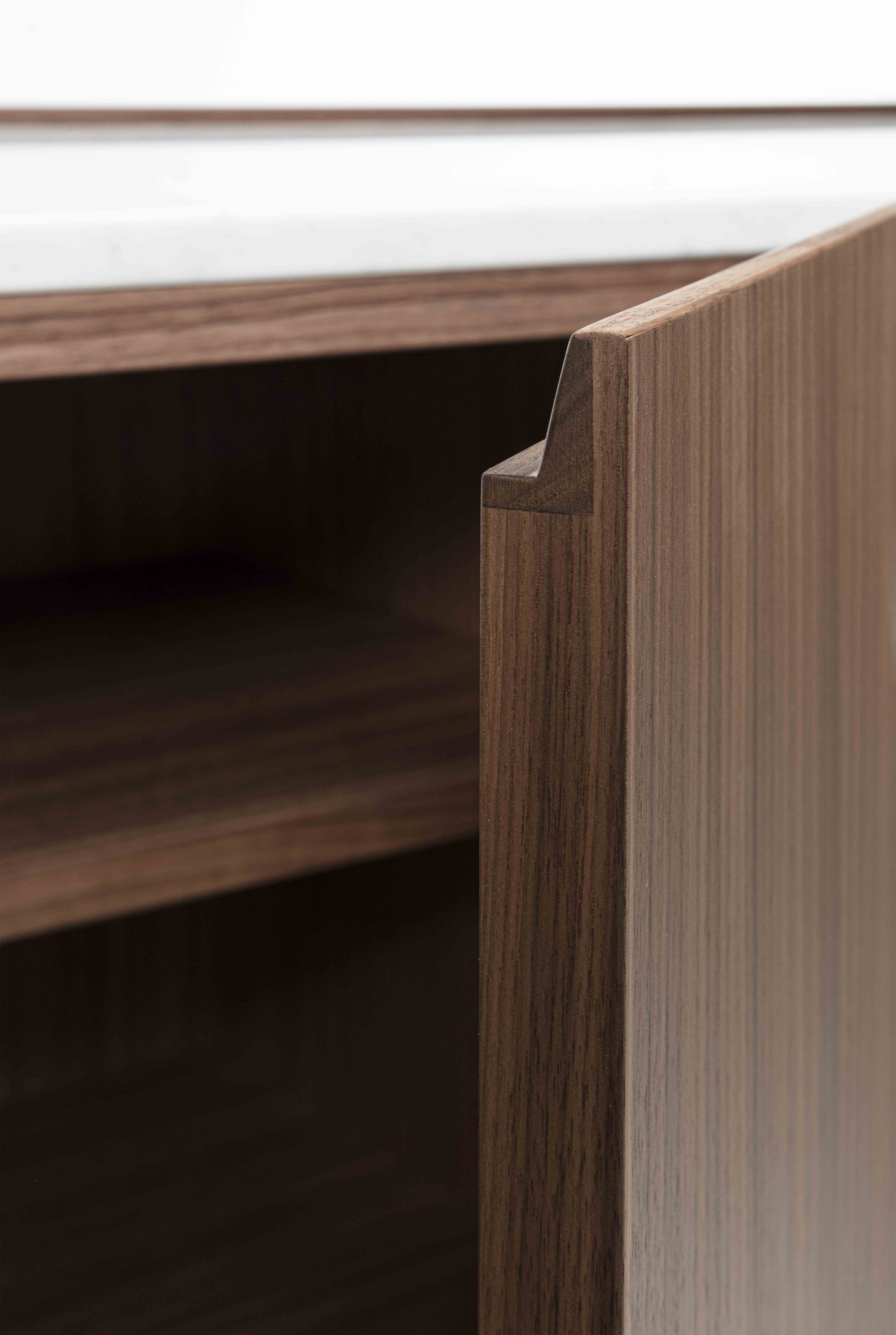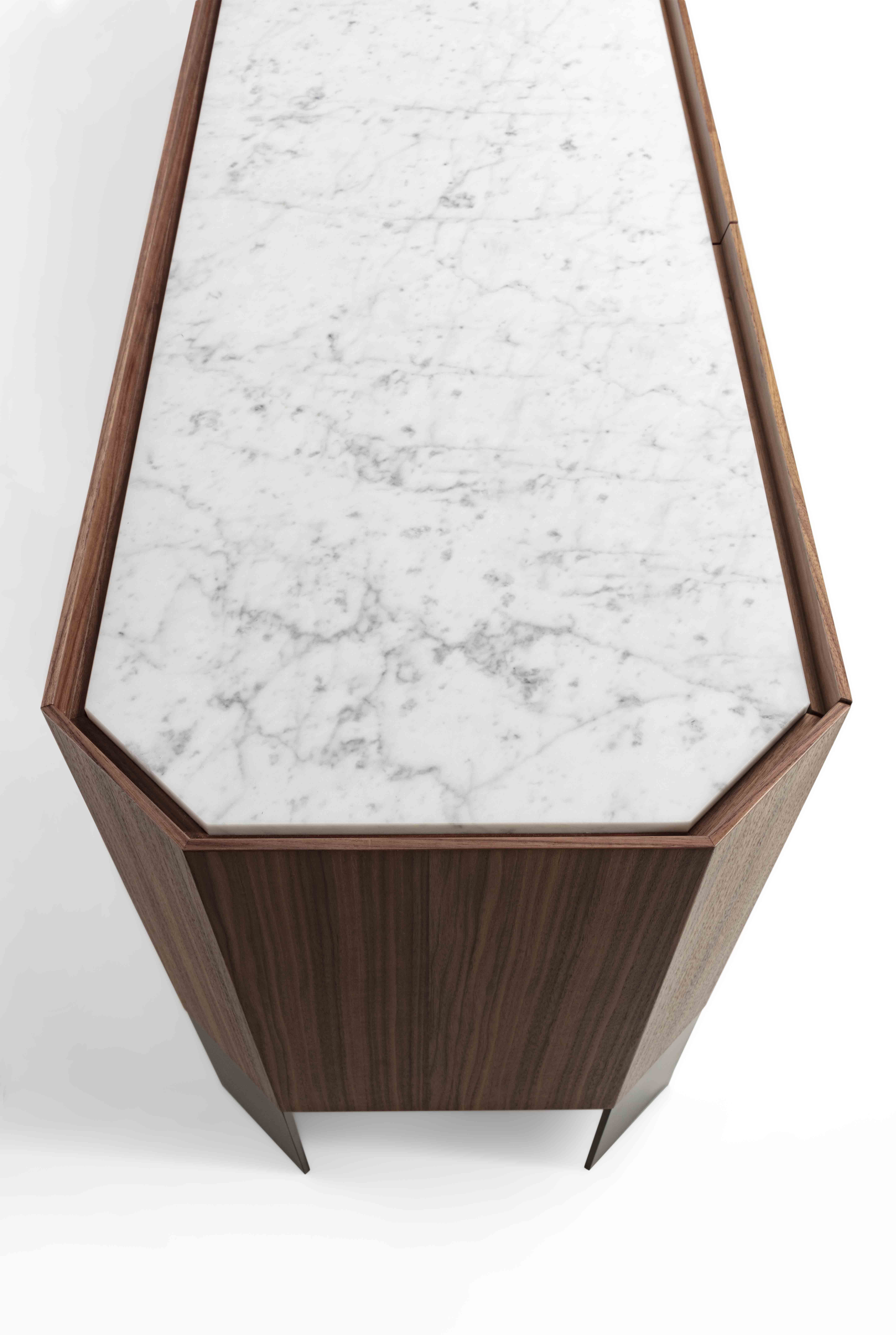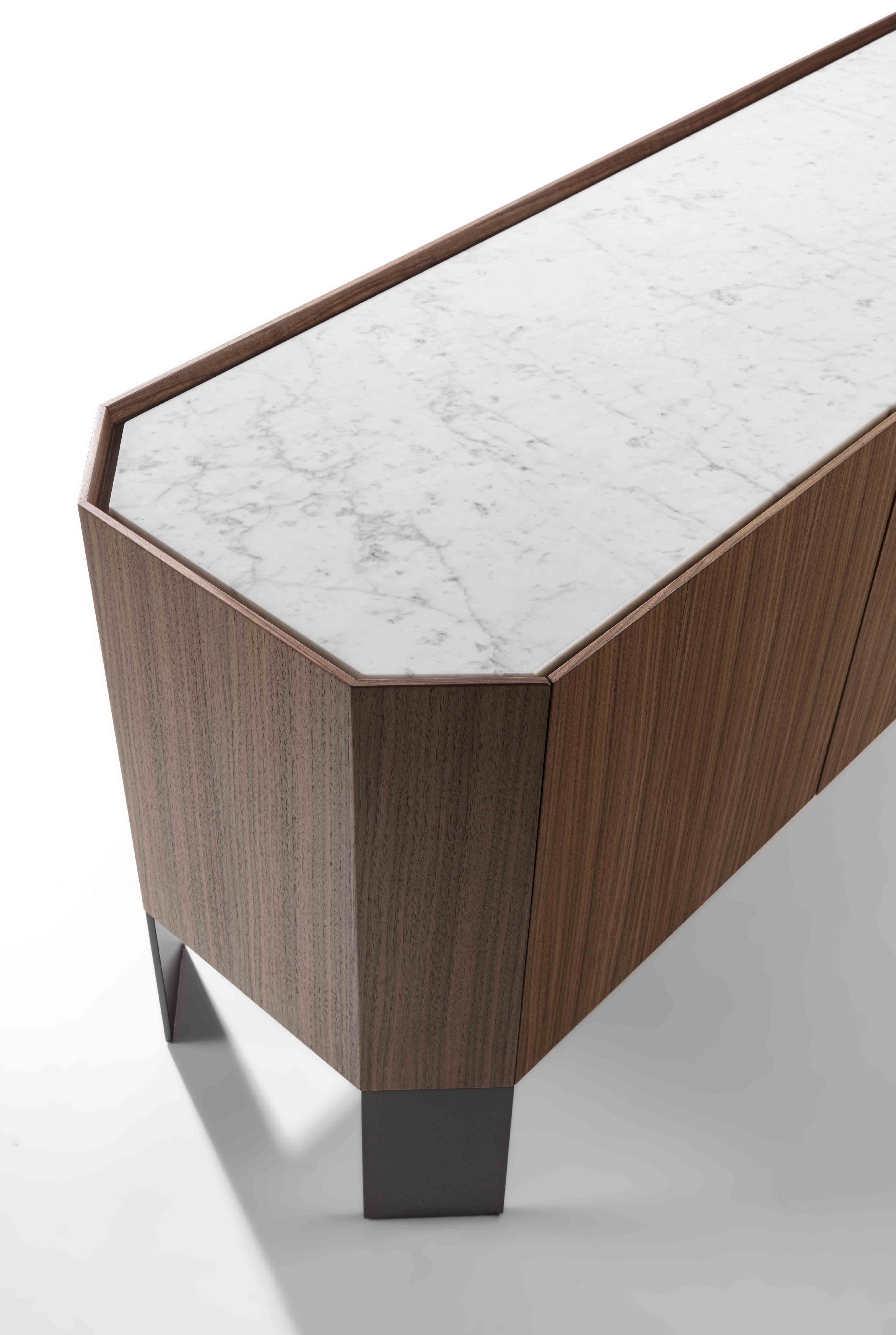 Storage unit with three/four wooden doors and marble or wooden top. The base is in metal and the internal division is characterized by wooden shelves.