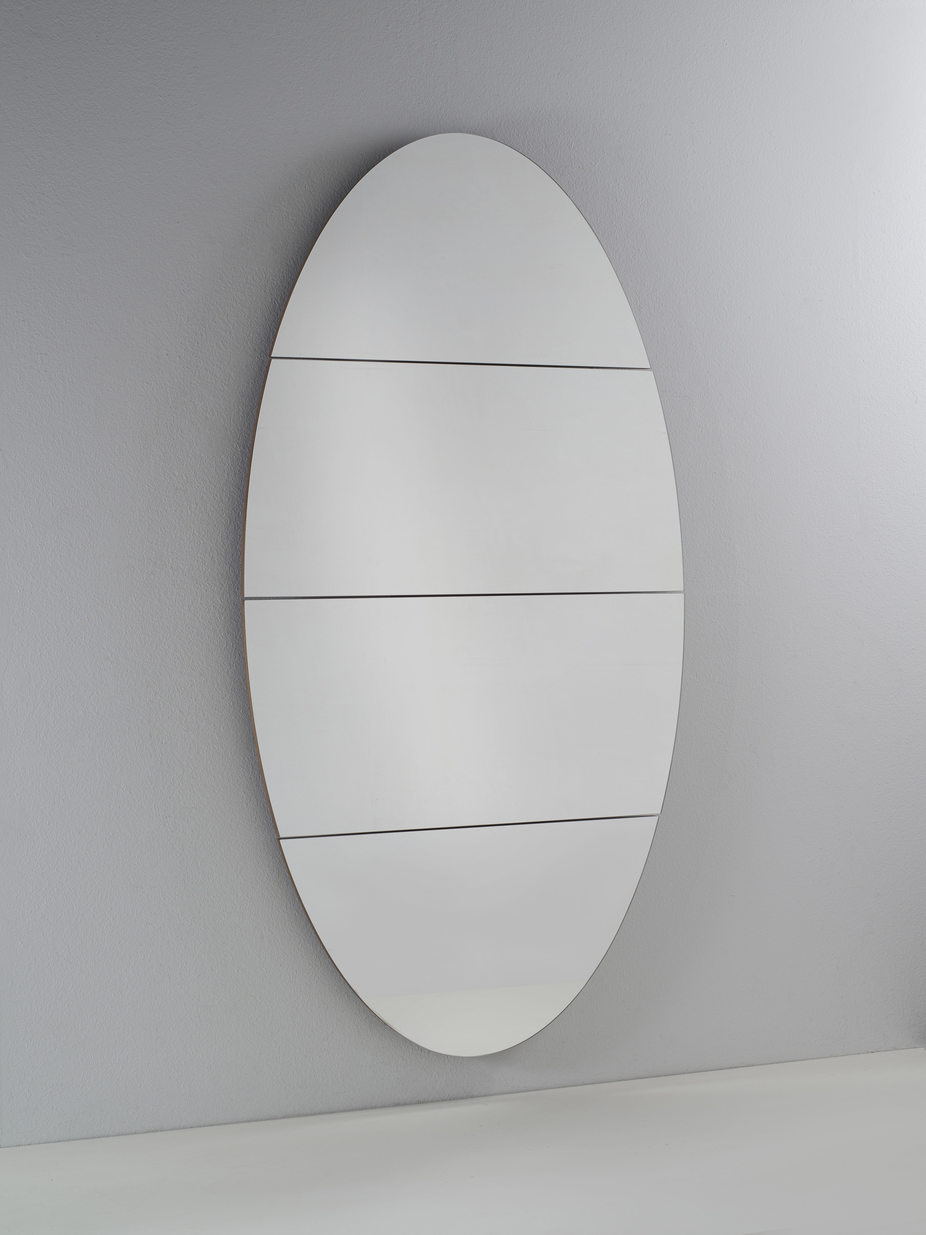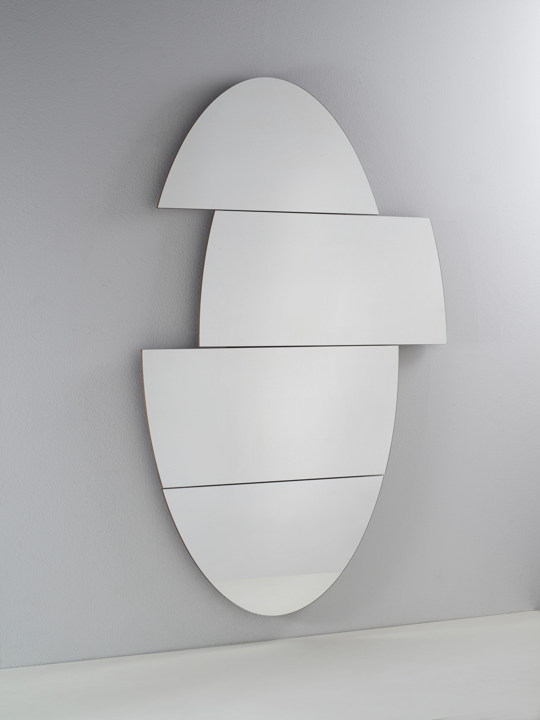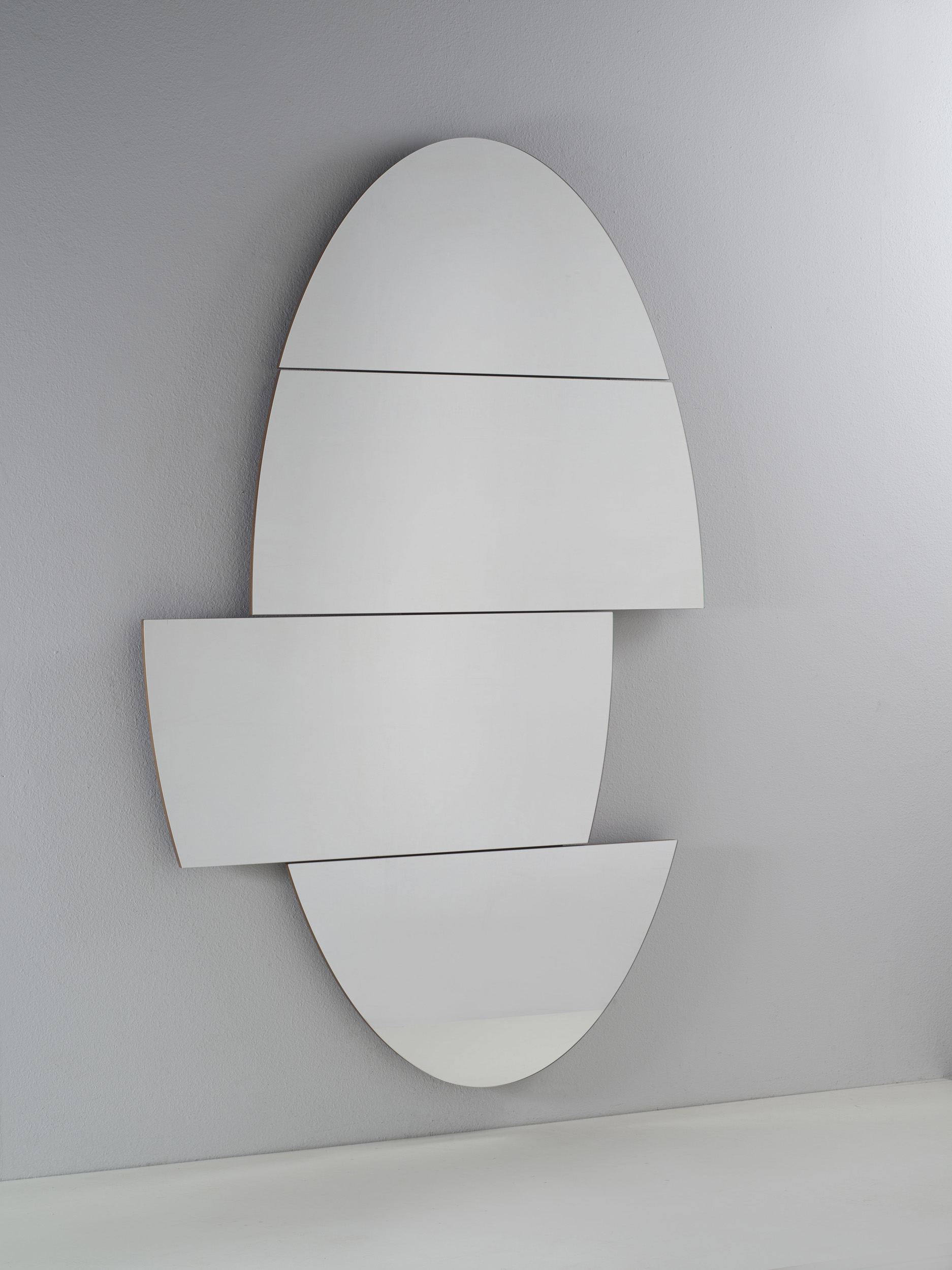 Oval-shaped mirror, with the particularity of being able to move some parts of the mirror, to give life to new mirroring shapes