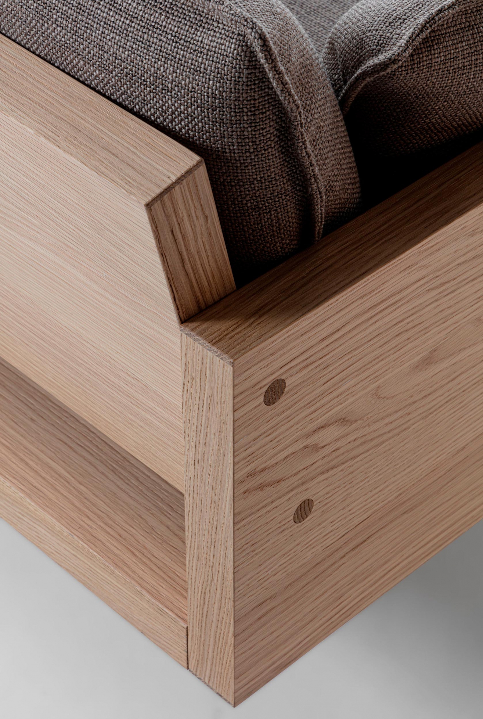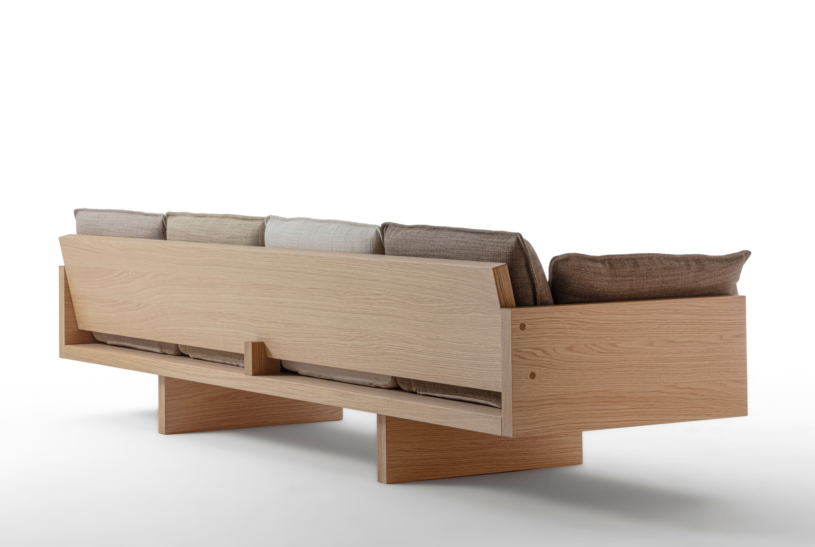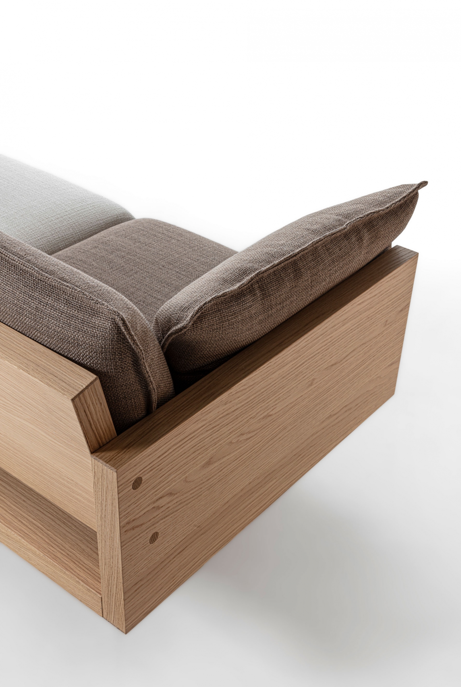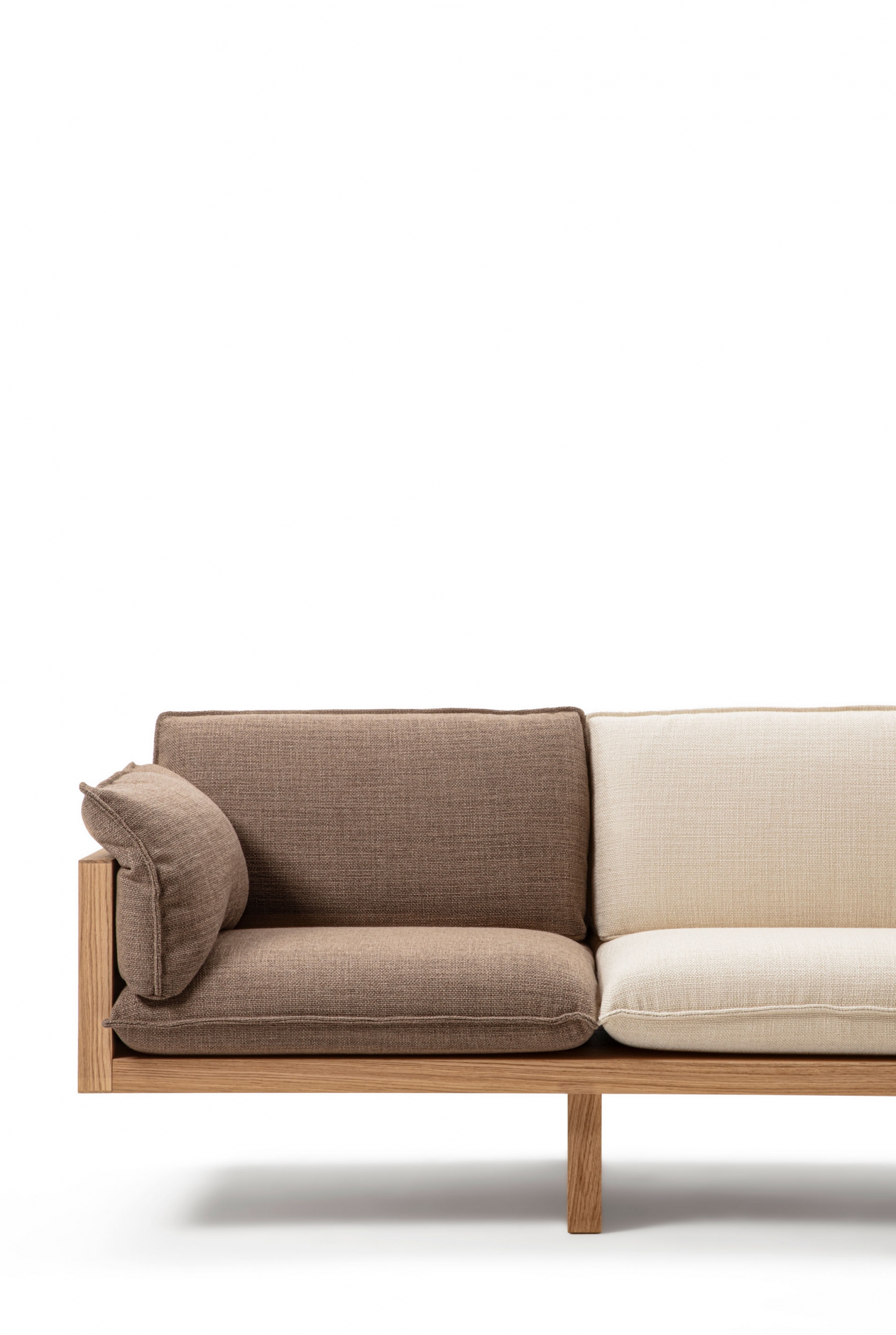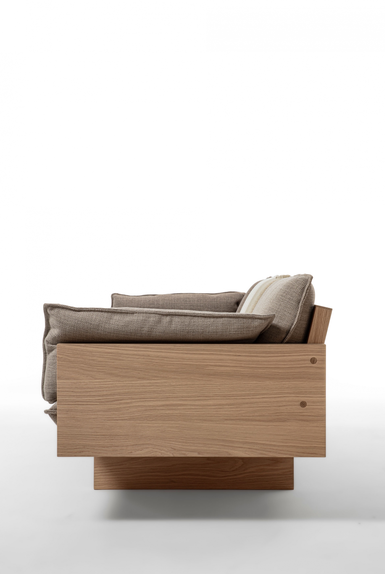 A sofa crafted with a wooden frame and adorned in either fabric or leather upholstery that encompasses seating, backrests, and armrests.