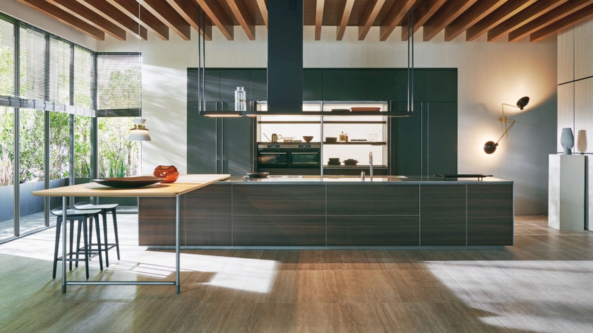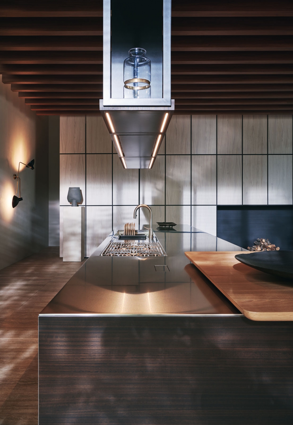 2018年推出新款設(shè)計理念獨特、簡單、具有線性結(jié)構(gòu)的柜門。鋁制框架和錫金屬柜門,并且柜門設(shè)置精致柜面。柜門上方邊緣均有凹槽設(shè)計,便于開合。這款廚房與帶有分隔板設(shè)計的全新VVD抽油煙機柜罩以及Hi-Line6吧臺搭配而成,配有堅固的橡木和黑色橡木工作臺,圓角與斜邊設(shè)計,鋁質(zhì)結(jié)構(gòu)制成。島柜柜體采用珍貴材質(zhì)桉樹制成,柜門為鋁合金框架,工作臺采用不銹鋼封邊,配有水槽和和爐灶。