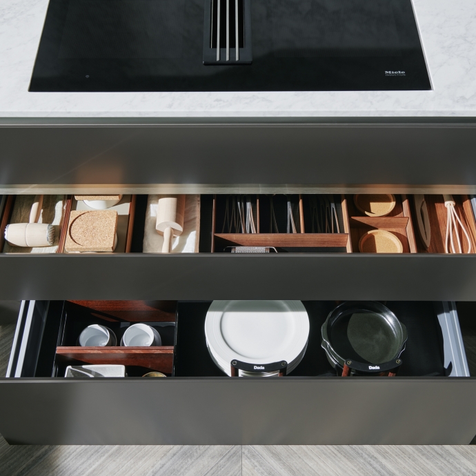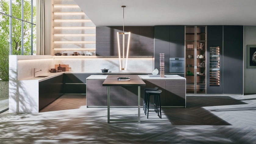 Prime的設(shè)計(jì)特征在于全方位展現(xiàn)凹槽設(shè)計(jì)的潛能。不同組合打造出符合不同審美需求的款式。凹槽線性設(shè)計(jì),這一與眾不同的解決方案可以滿足不同的個(gè)性定制需求。Prime柜門上方采用45度斜角設(shè)計(jì),便于開合,使設(shè)計(jì)更加符合人體工程學(xué)。 這一設(shè)計(jì)還增加了新款的青銅飾面玻璃柜門、深灰色吊柜和Flair高柜,模塊兩側(cè)均帶有隱藏式LED照明設(shè)施,以及新型鋁合金的錐形擱板。prime 吧臺(tái)結(jié)構(gòu)采用鈦鋁和錫金屬制成,工作臺(tái)采用新型深色核桃木制成,還有Francesco Meda為Molteni&C設(shè)計(jì)的Woody椅子系列中Woody椅子。
