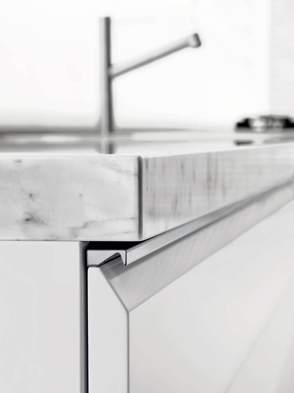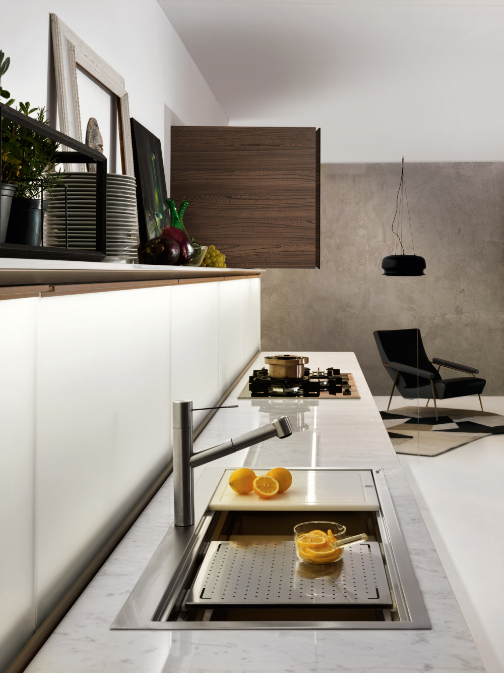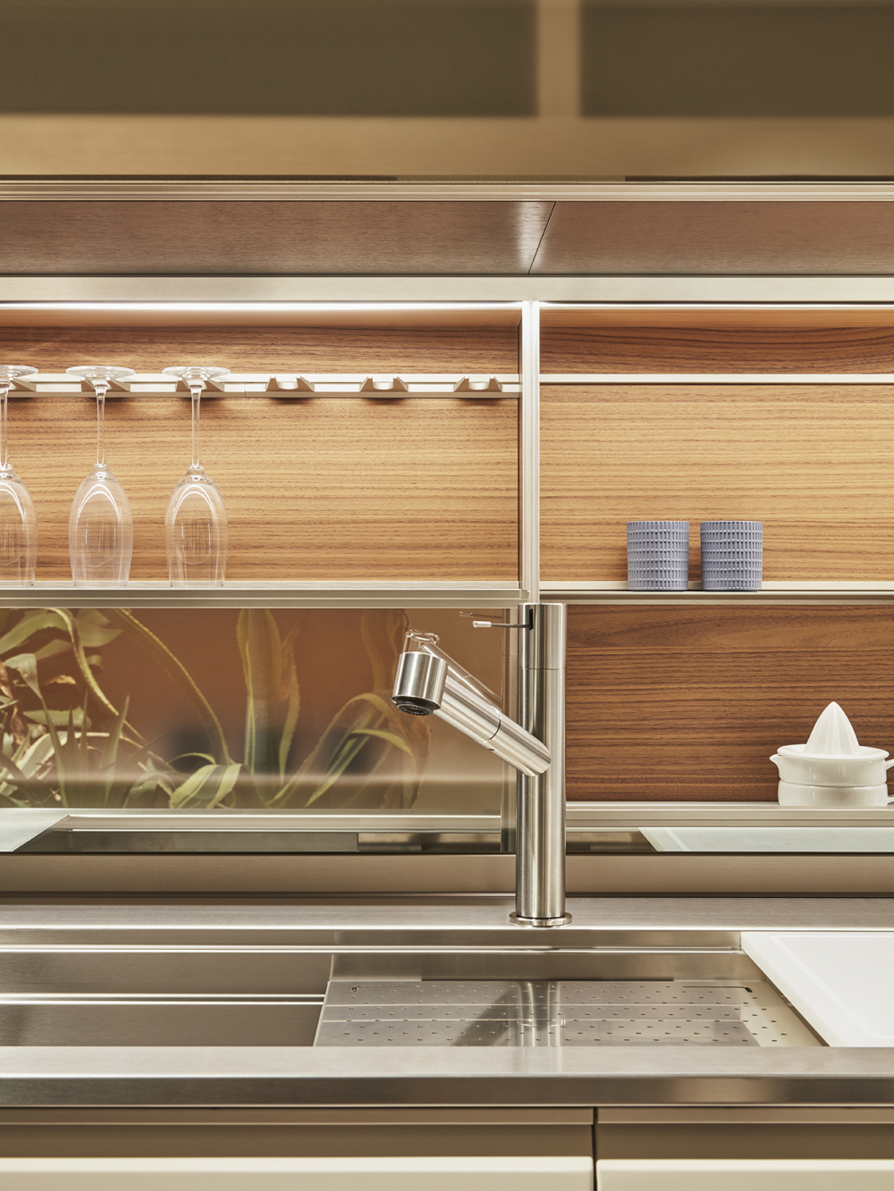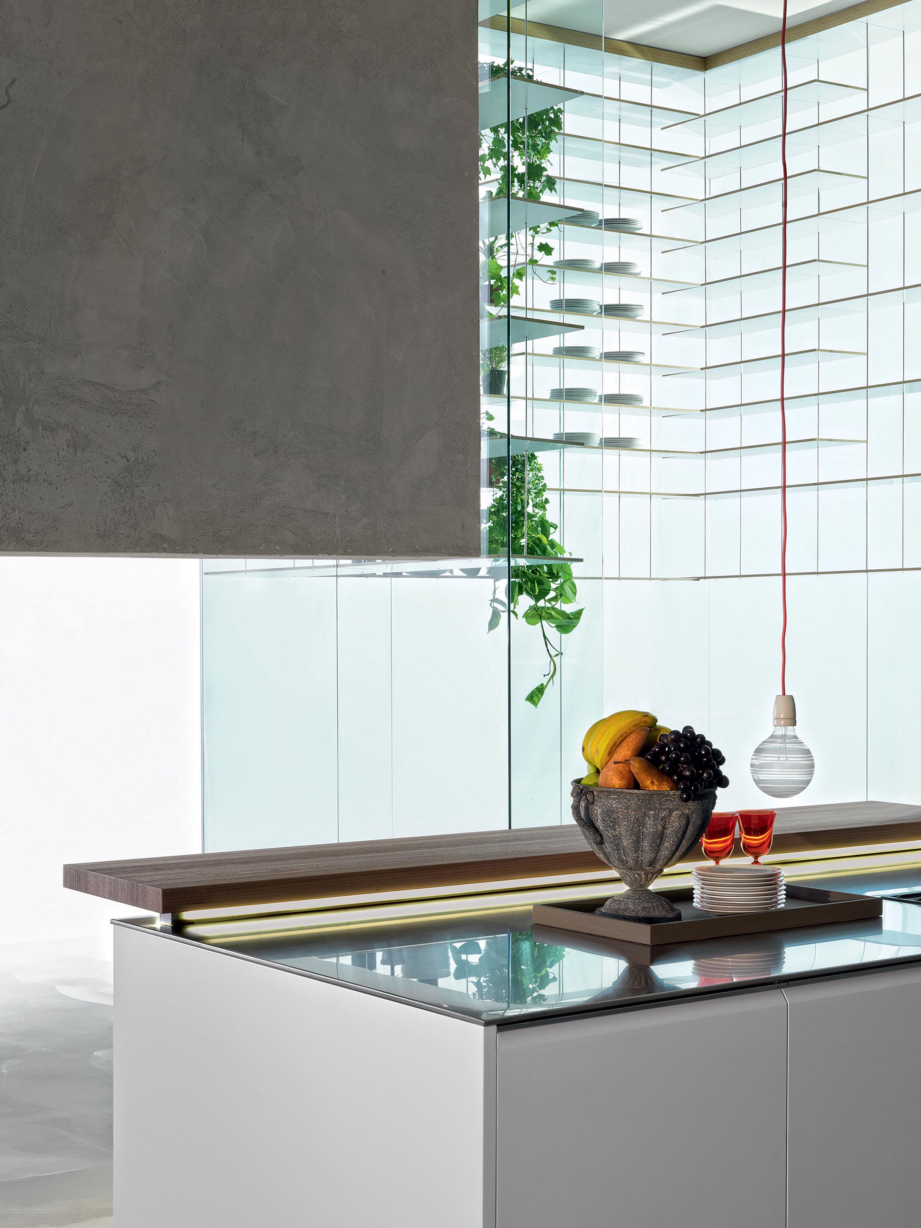 worktop can be concealed by sliding the glass doors, with a mechanism patented by Dada. The LED lights