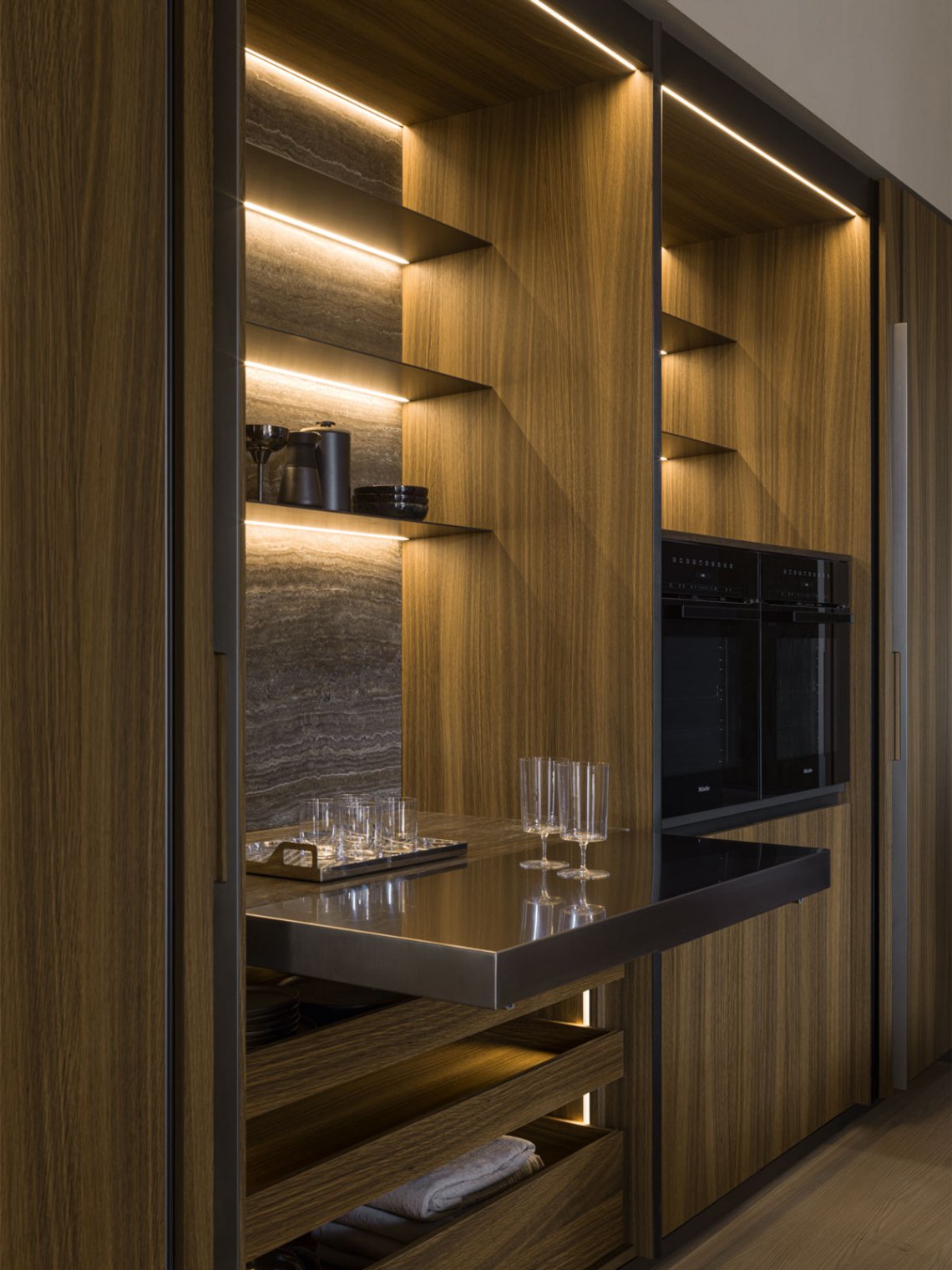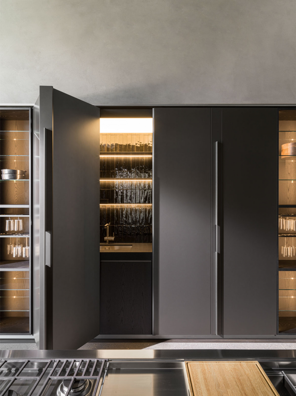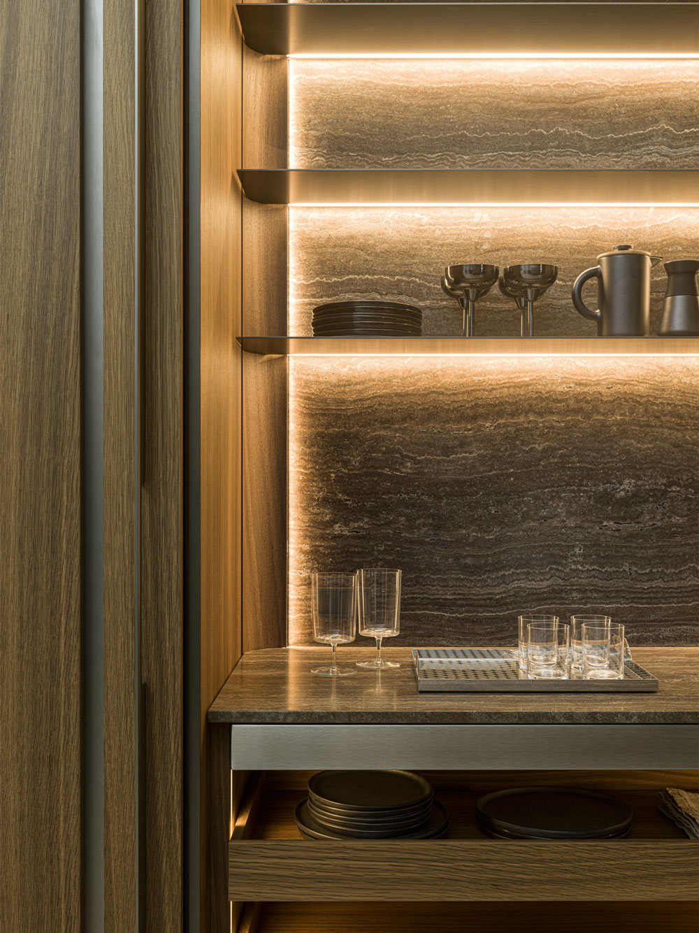 Equipped with an exclusive mechanism, it can be inserted across all Collections. The project stands out in all its exclusivity with a special version, a precious dress that shows Molteni&C|Dada's taste for the refined: a backrest with two concave side supports, between which a second backrest is inserted, to which Wing shelves can be added.