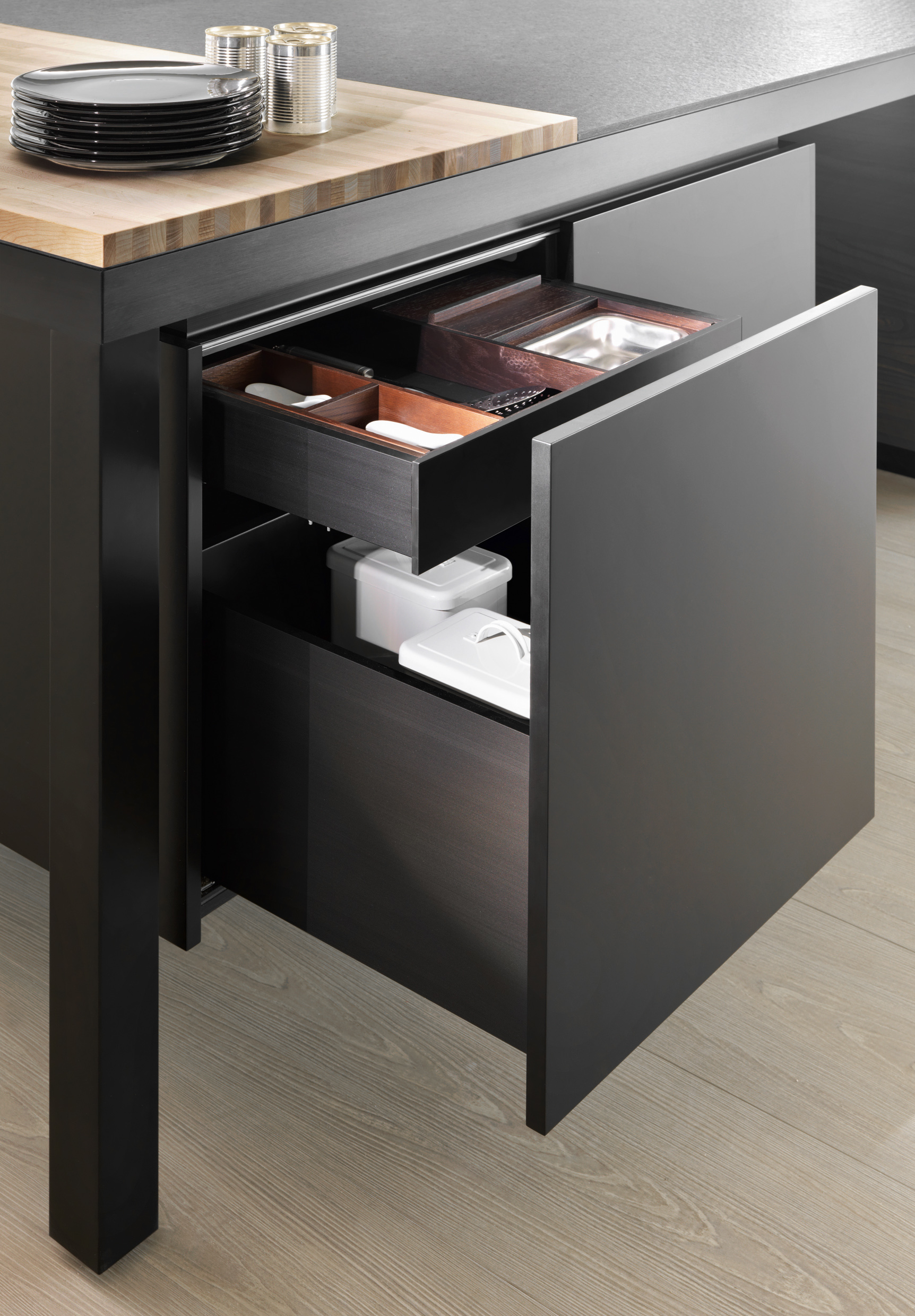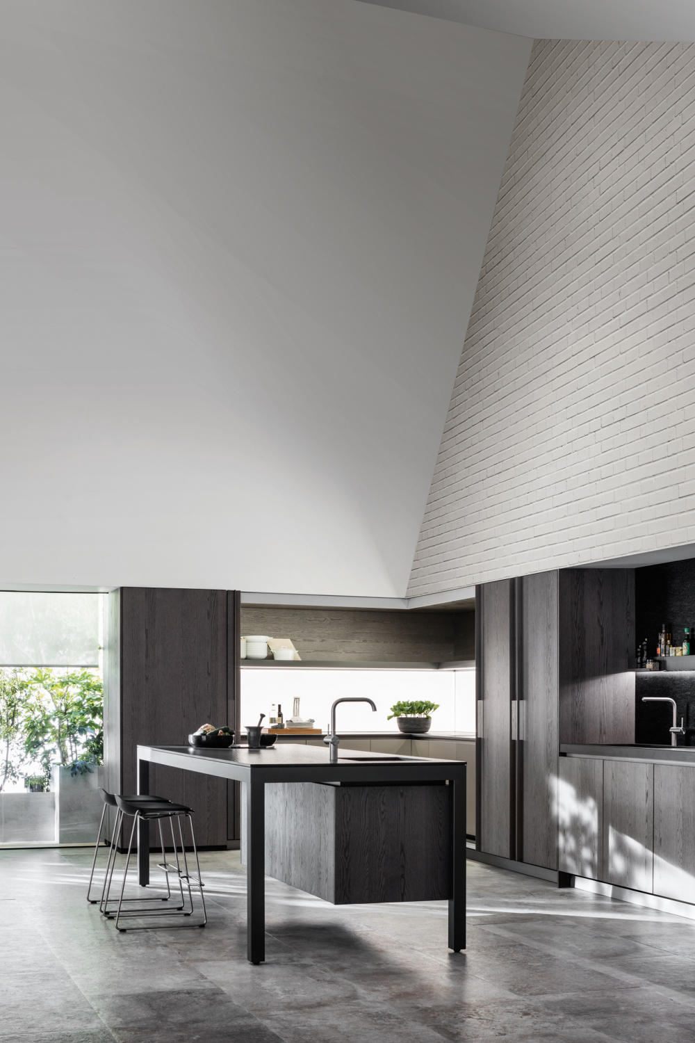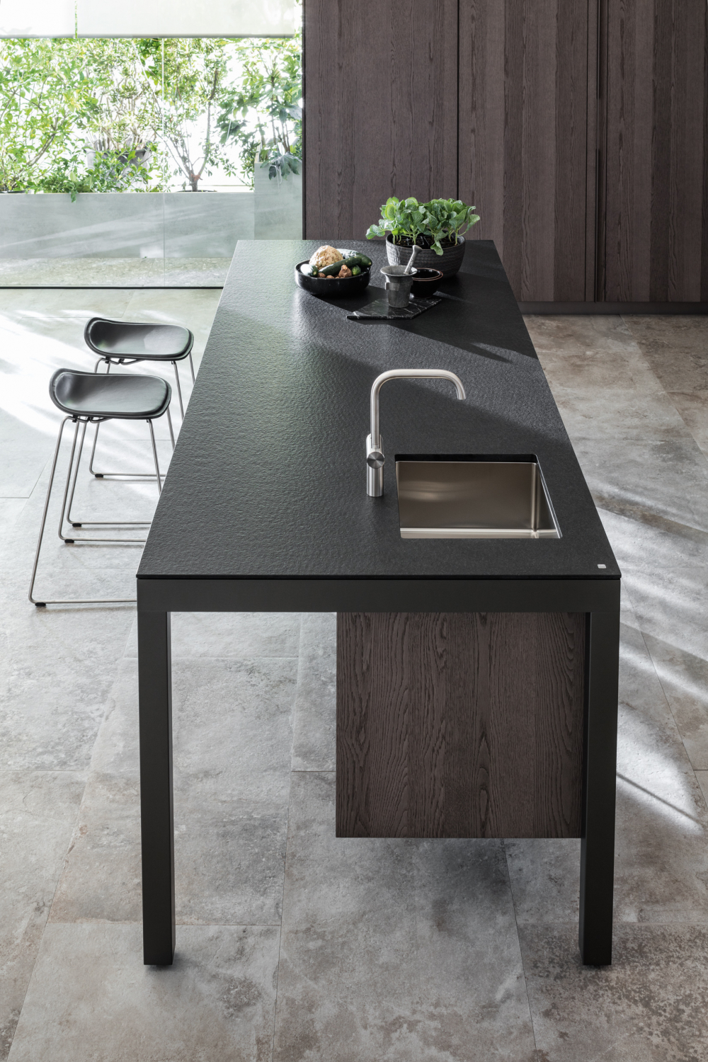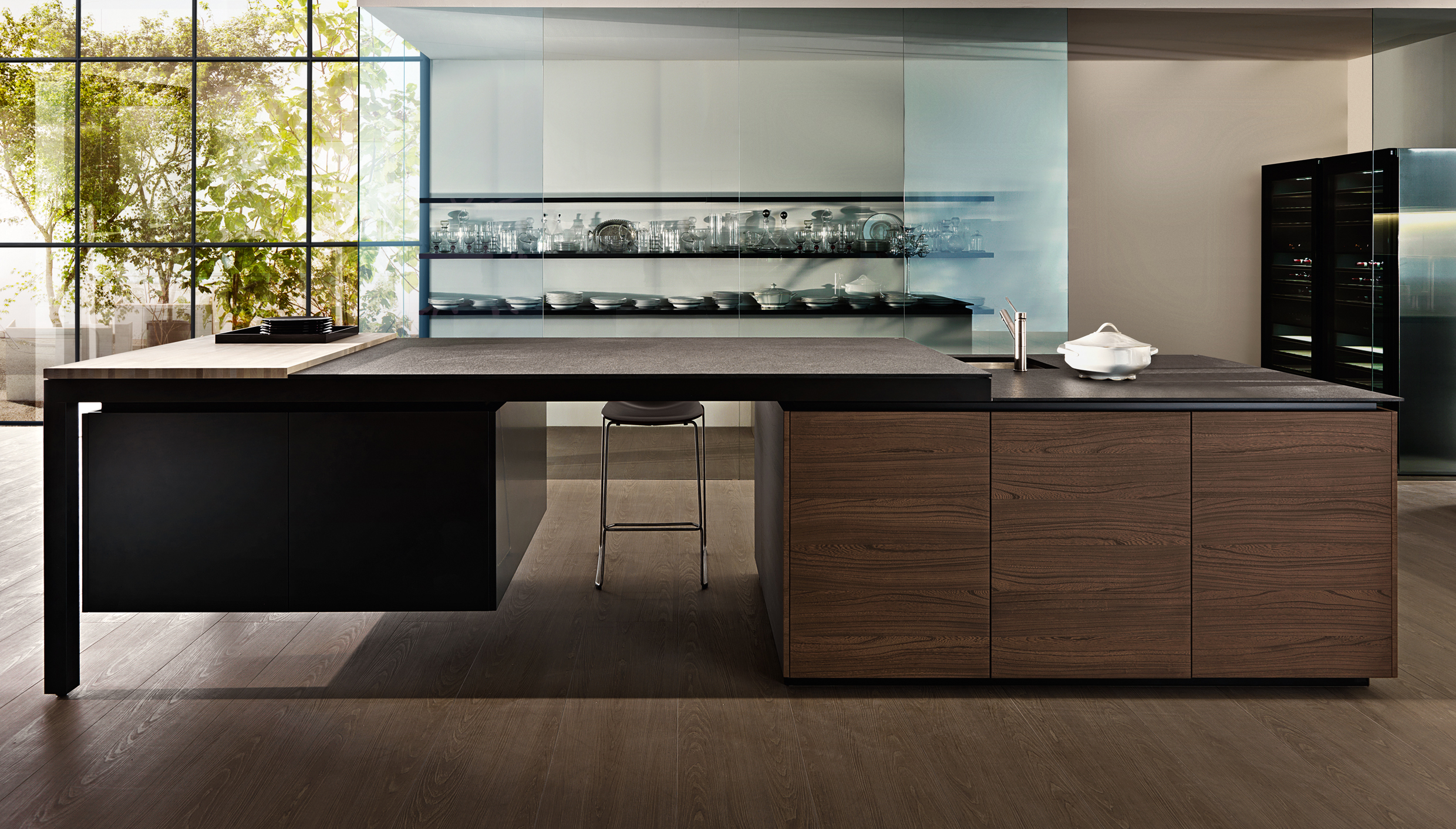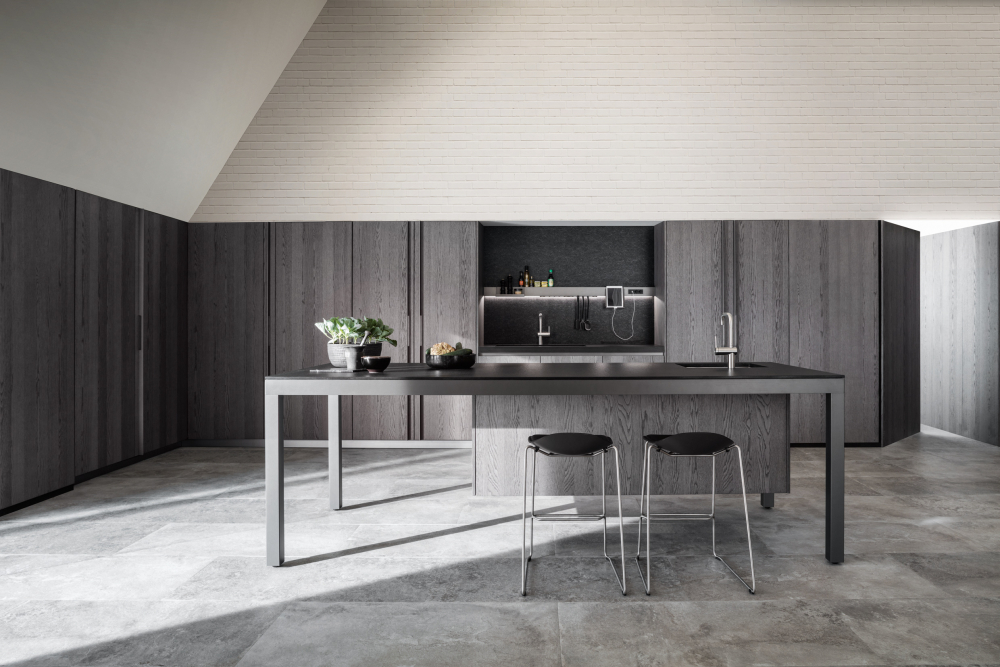The new Banco redefines material contrasts and opts for black and white. The island supports the storage