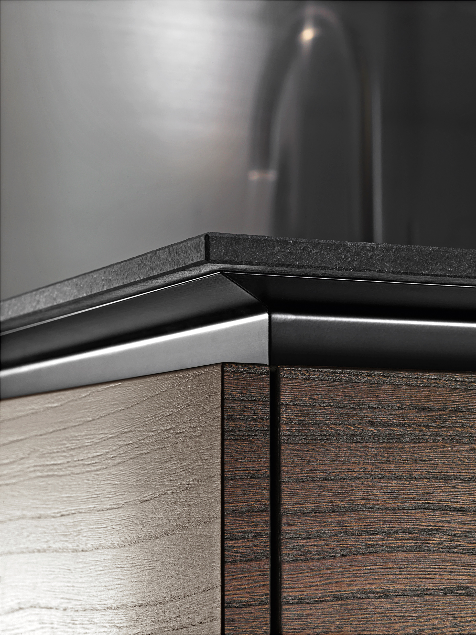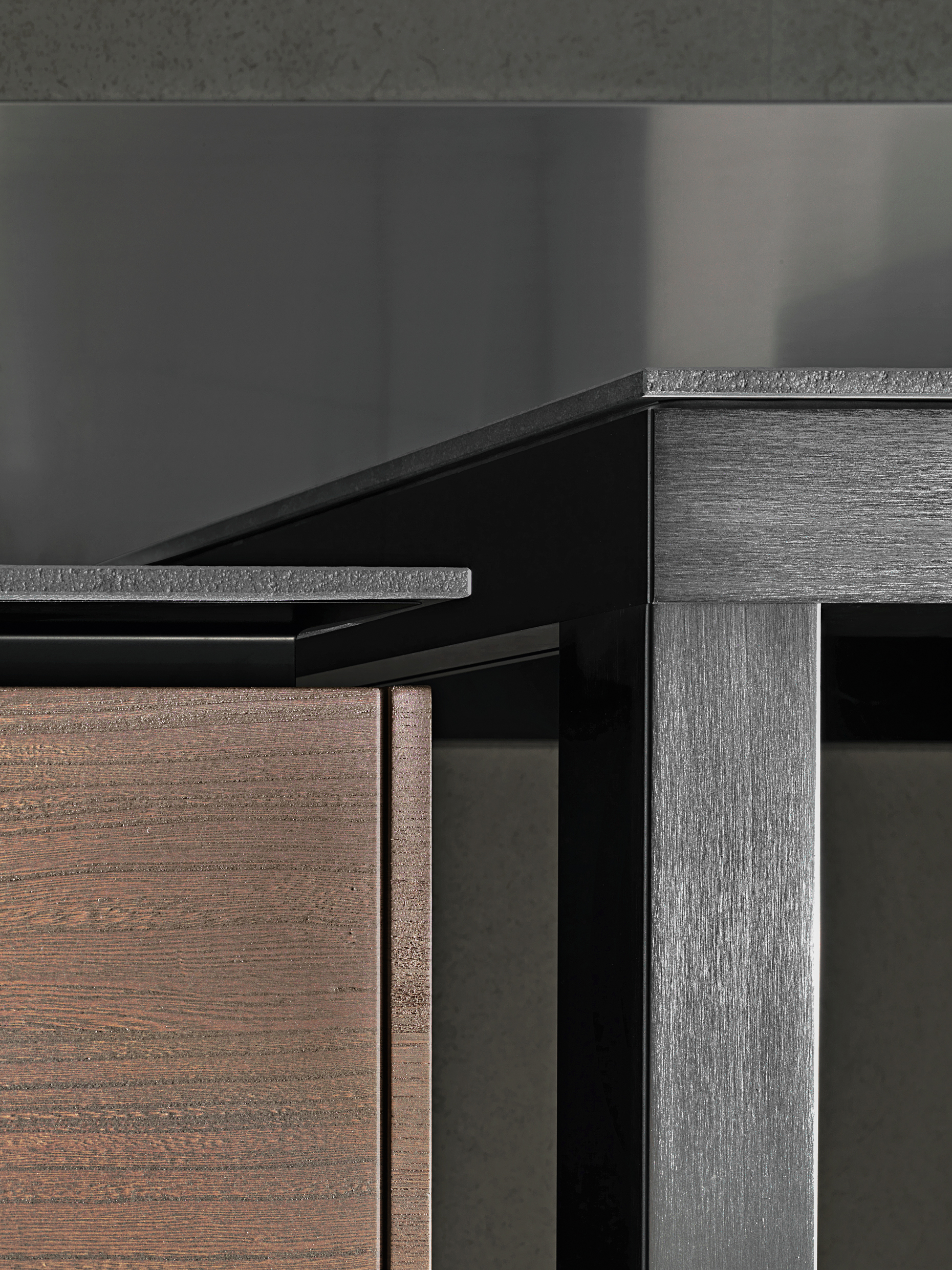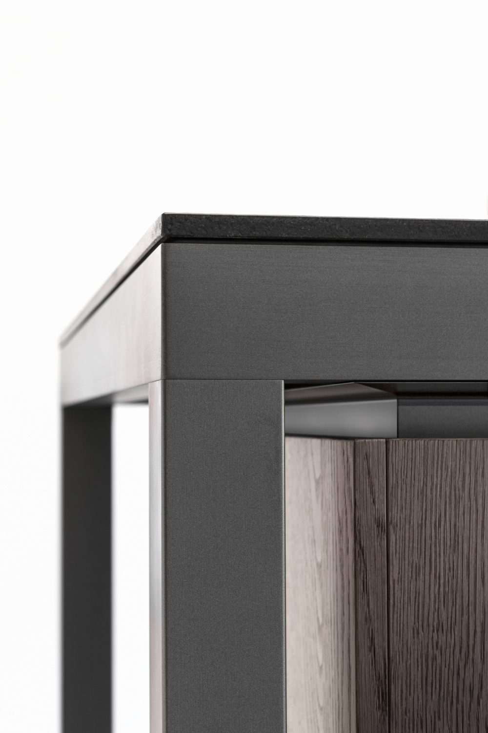 units below. The slim worktop rests on the aluminium frame, concealing its solid core.