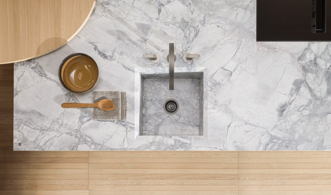 The fascination of monolithic objects made of a single material has inspired Vincent van Duysen to apply this concept to his latest creation, the Intersection kitchen. A single material, natural stone, with which to create a unique, sculptural and architectural object.
