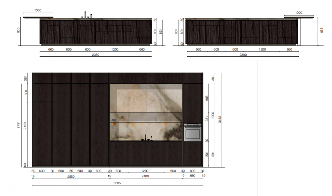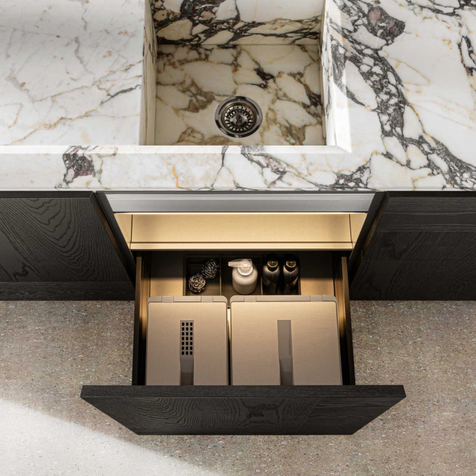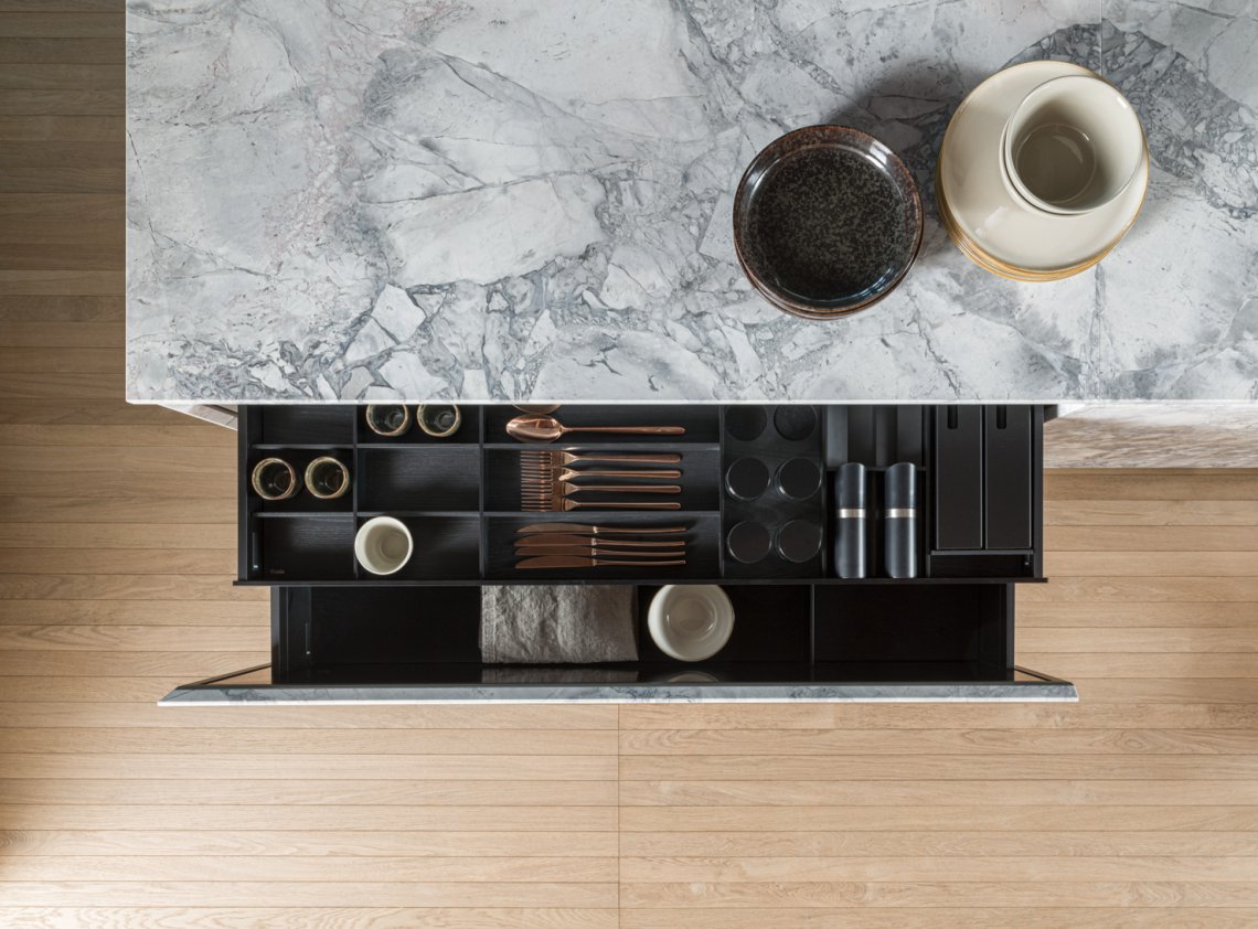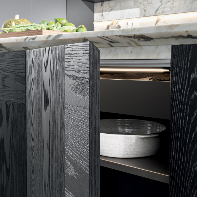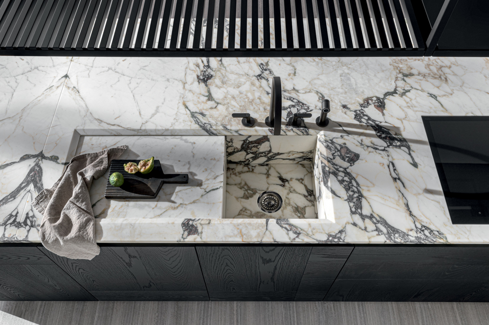 Its surfaces intersect to create patterns of light and shadows, solid worktops with important customisable sections with almost imperceptible profiles or sections chiselled like sculptures.