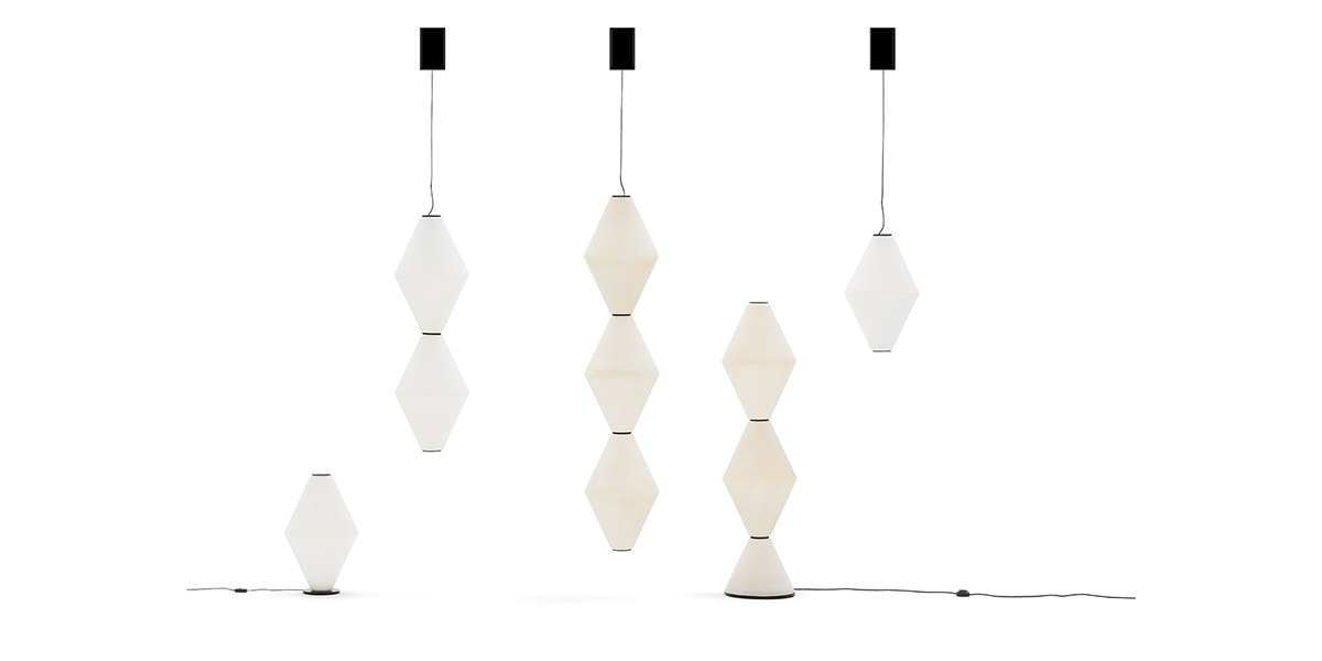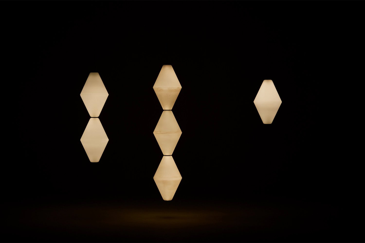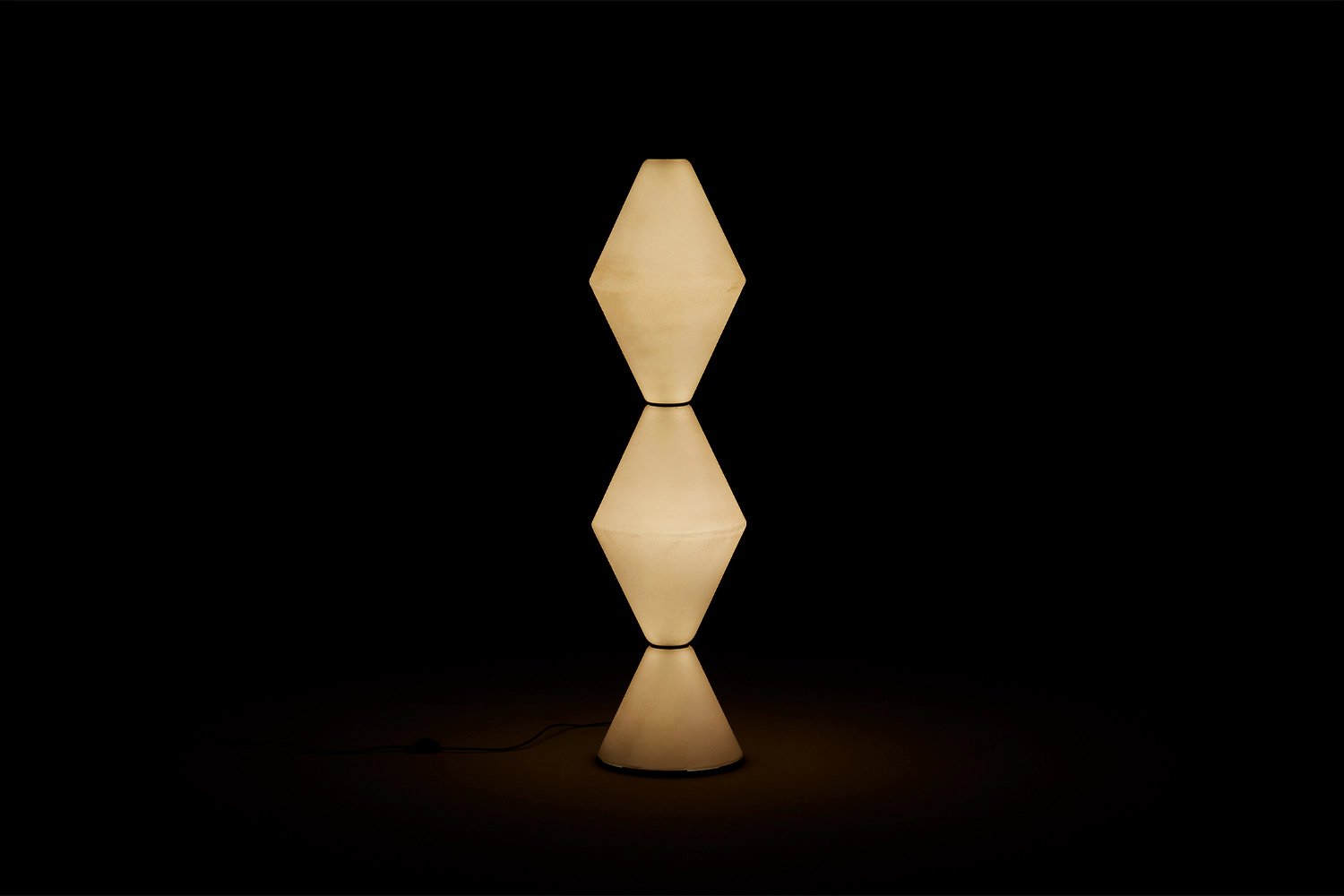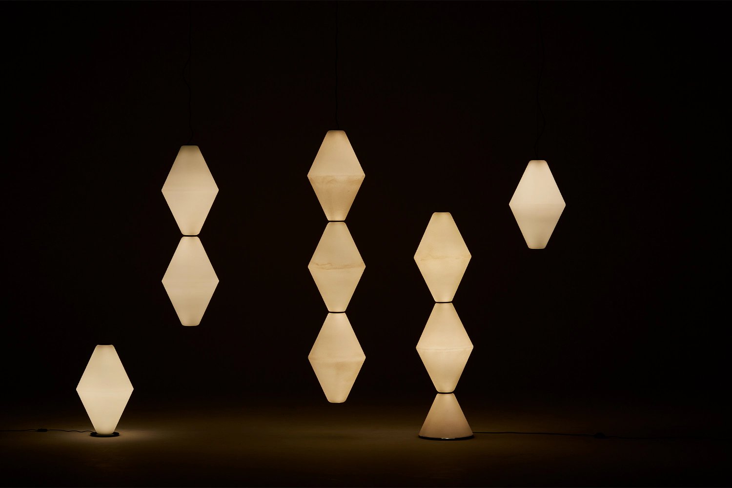 Matter at the service of light. Helium is a modular lamp, designed by Elisa Ossina for De Padova, that serves as a sculpture of light, resembling a series of geometric shapes characterised by a flowing rhythm, alluding to the possibility of infinite expansion.