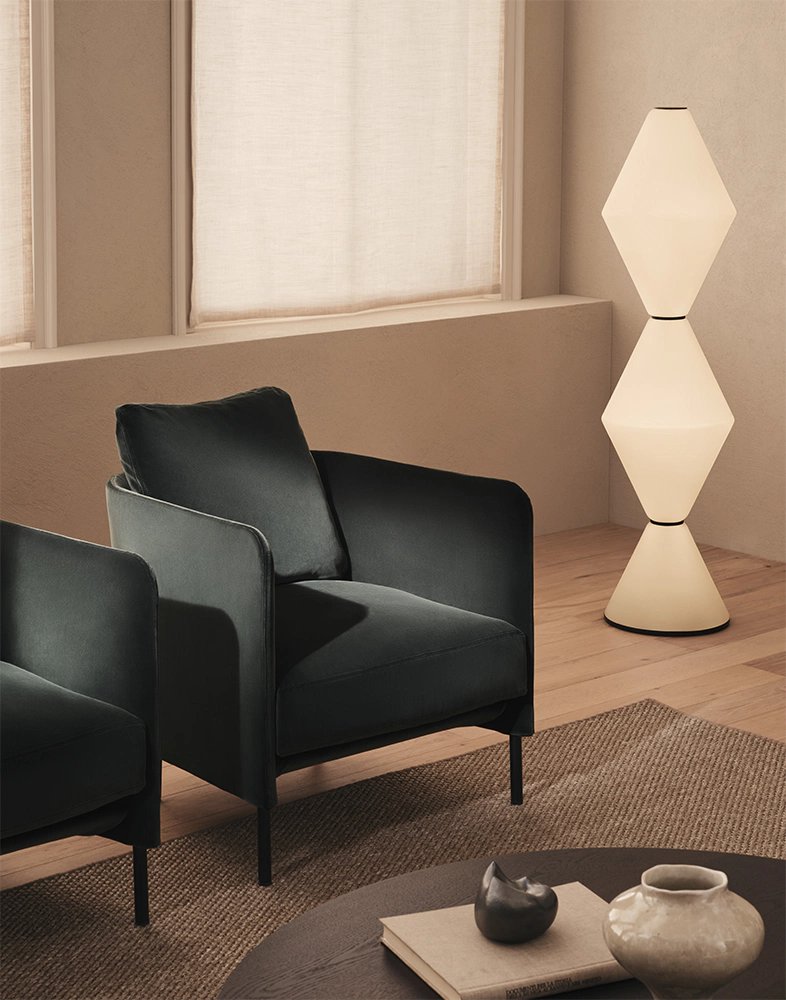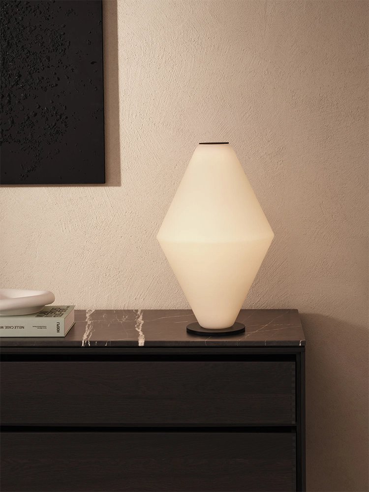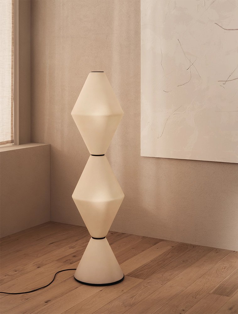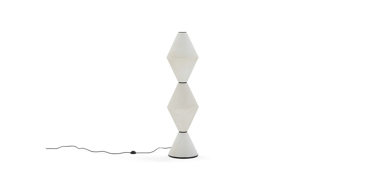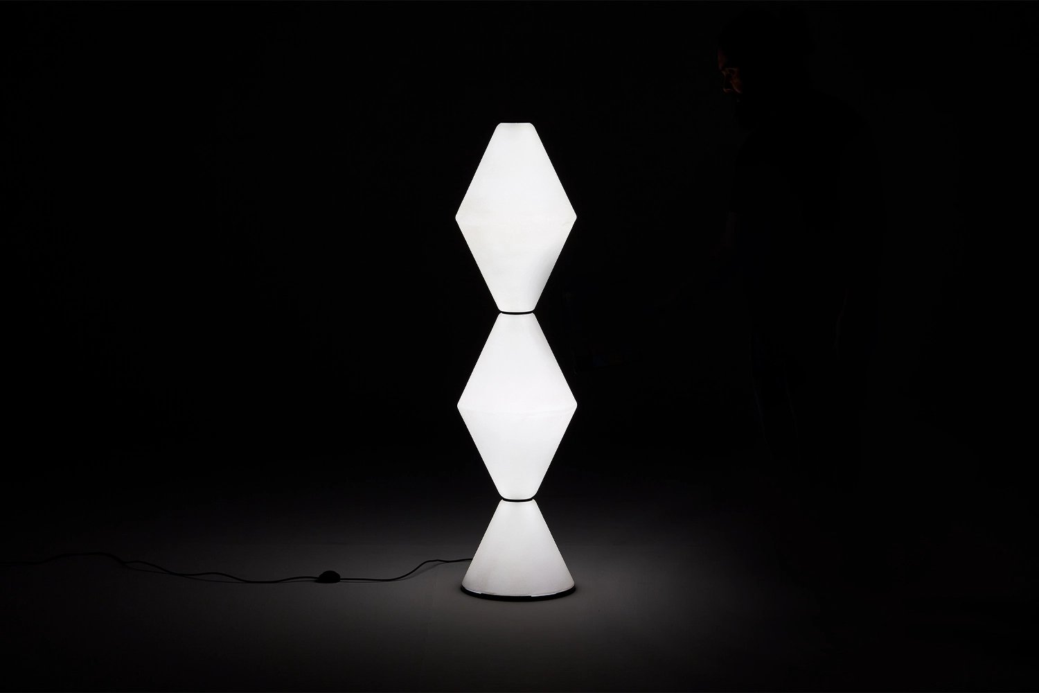 Matter at the service of light. Helium is a modular lamp, designed by Elisa Ossina for De Padova, that serves as a sculpture of light, resembling a series of geometric shapes characterised by a flowing rhythm, alluding to the possibility of infinite expansion.