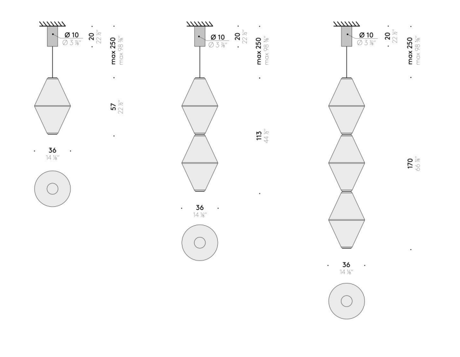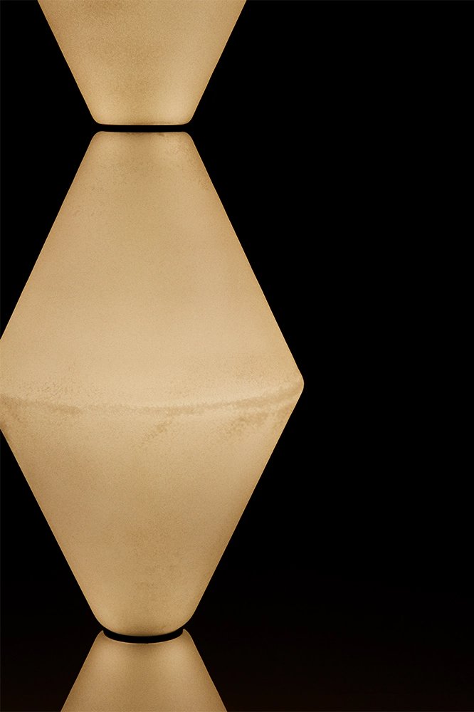 Featuring one, two or three modules, this lamp is expressed in the warm reflections of the glass, opening up the imagination to surprising compositions and evocatively entering the scene, even in spaces marked by important heights. Helium is available in two different finishes: in glass with special craftsmanship, working the still-warm matter with micro-sand grains to achieve exclusive, soft shading effects; or in hand-blown triplex opaline and etched glass, which softens the transparency, giving the surface a velvety appearance.