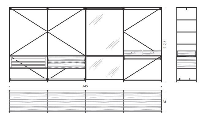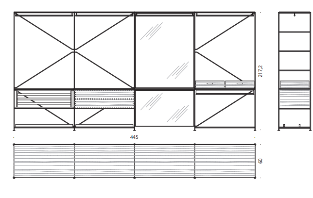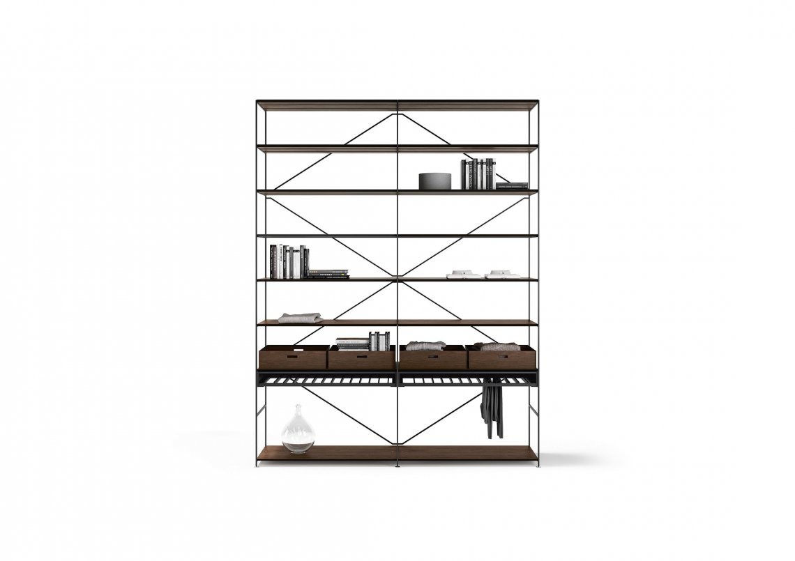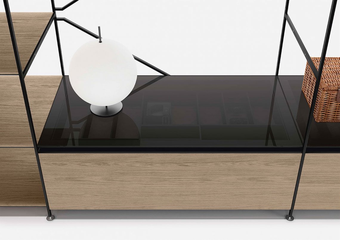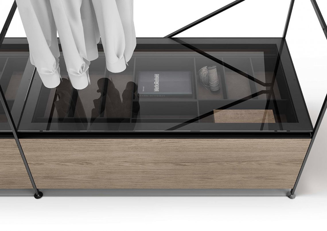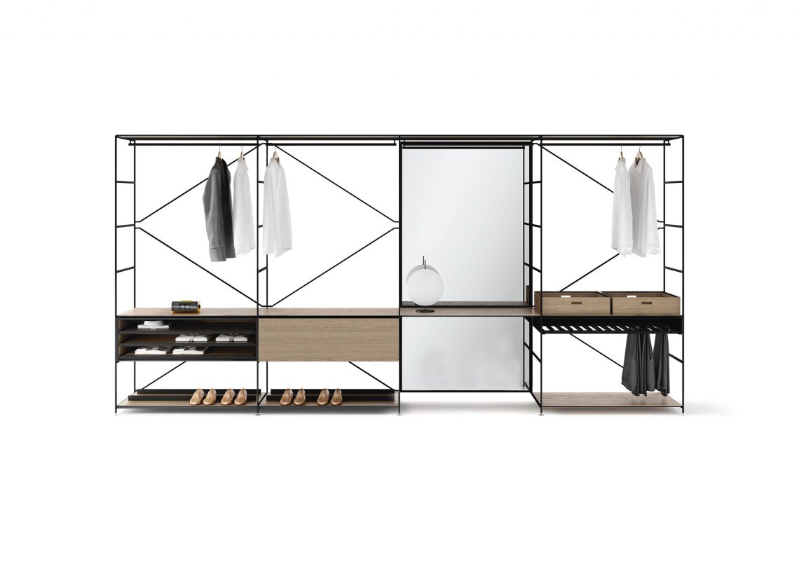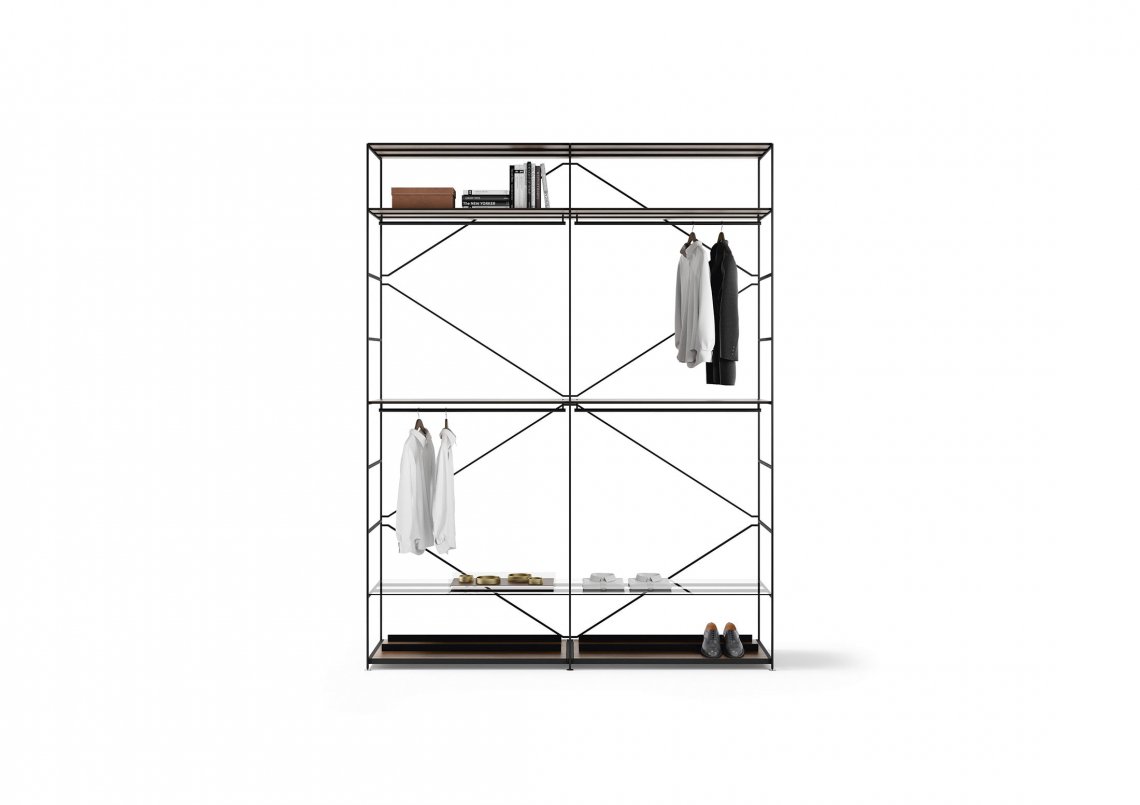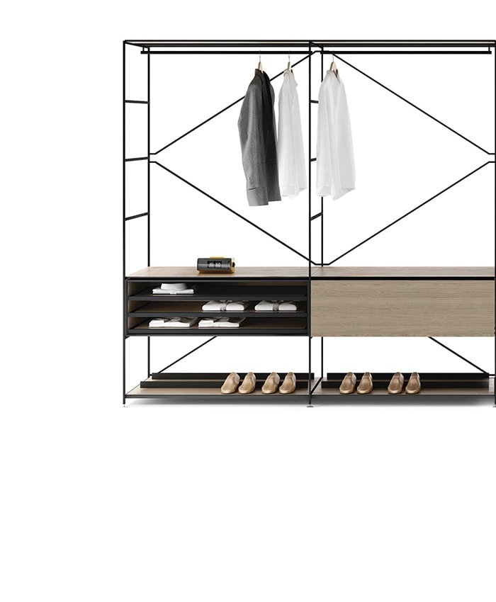 The essentiality of the structure reduces the overall dimensions to a minimum and makes it possible to better organise the elements that can be customised based on individual needs. It in enhances the wardrobe system or furnishes the sleeping area with a minimal and balanced solution.