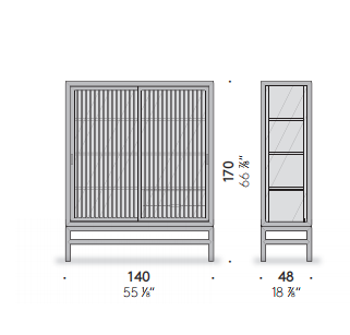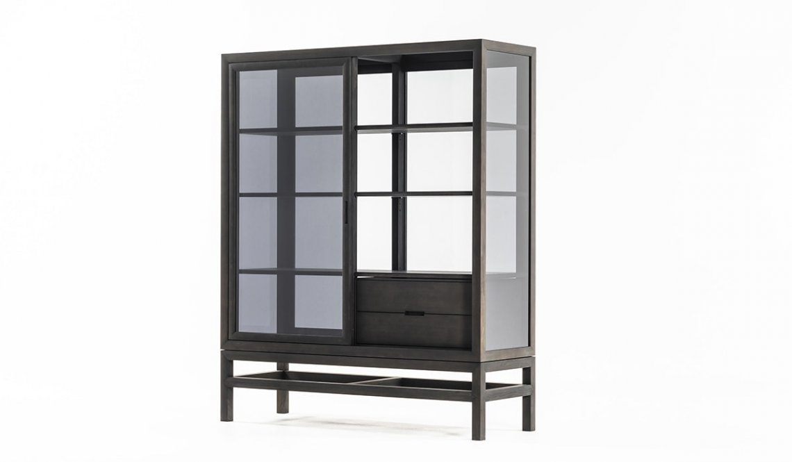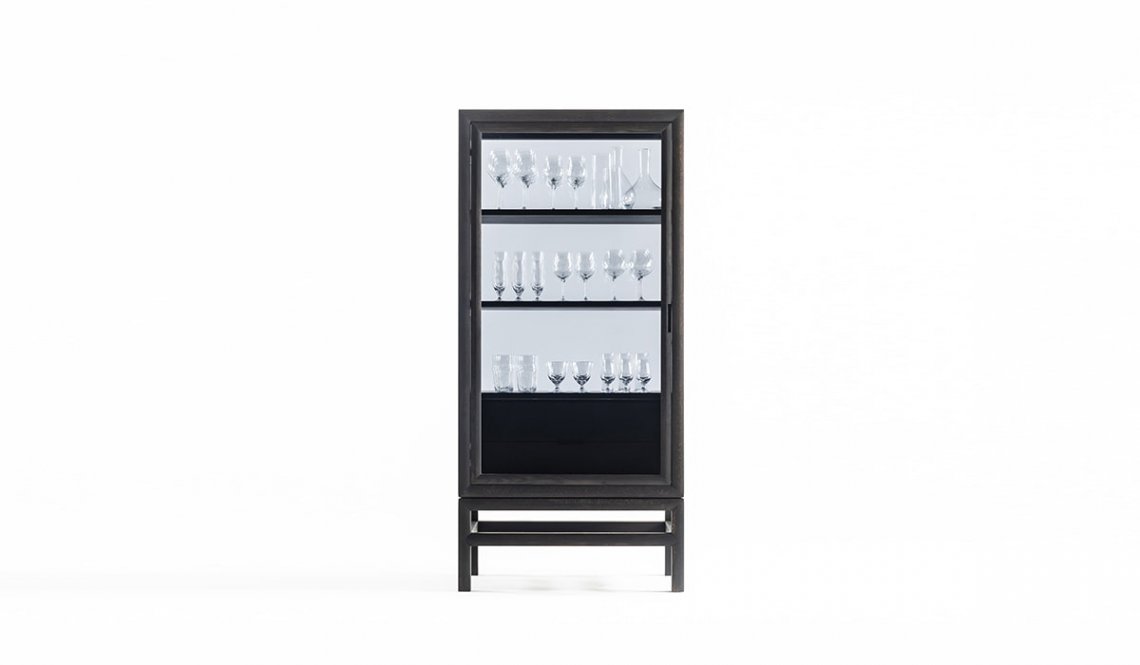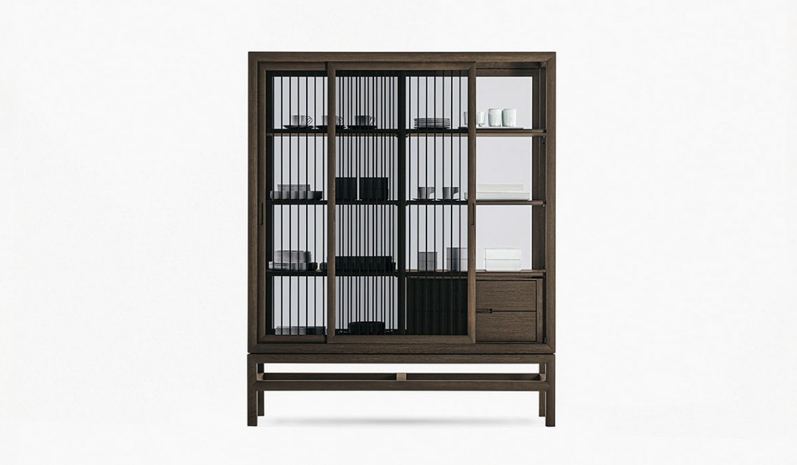 Silent cabinet was created to express the sensuous Japanese beauty as a modern piece of design. It is designed with five glass sides, to let in natural light and illuminate the items inside evenly. The sliding doors mounted on rails make it possible to save space regardless of their width. For one side of the cabinet, lattice doors can also be selected. The lattice door references traditional Japanese design, with a pattern made of thin and delicate wood pieces. The six-millimetre width of the pieces and the spacing between them are designed to harmonize Japanese tranquillity and modern taste. The presence of items inside can be perceived on both the front and back of the cabinet.