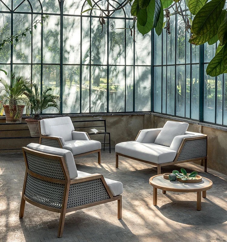 A collection of lounge chairs destined for large and prestigious outdoor spaces. The pickled or natural teak structure with metal core is covered with large cushions that welcome the body with a feeling of deep and enveloping comfort.