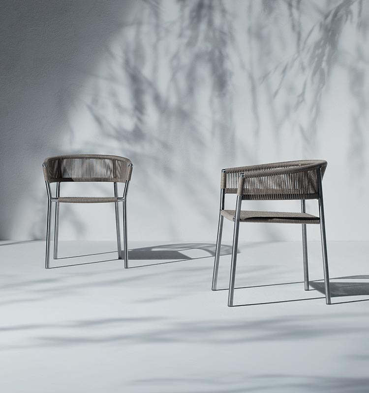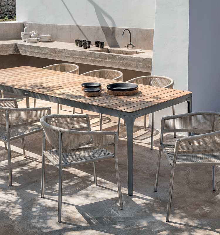 Kilt, the seat designed by Marcello Ziliani, available in versions with a teak or stainless steel structure, is able to express different looks and interpret the space that welcomes it.