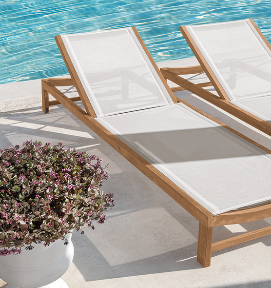 The solid and rational wood frame of the Sand sun lounger, with adjustable back, accommodates, in the lighter solution, convenient waterproof fabric or, in the version in teak throughout, a soft mattress.