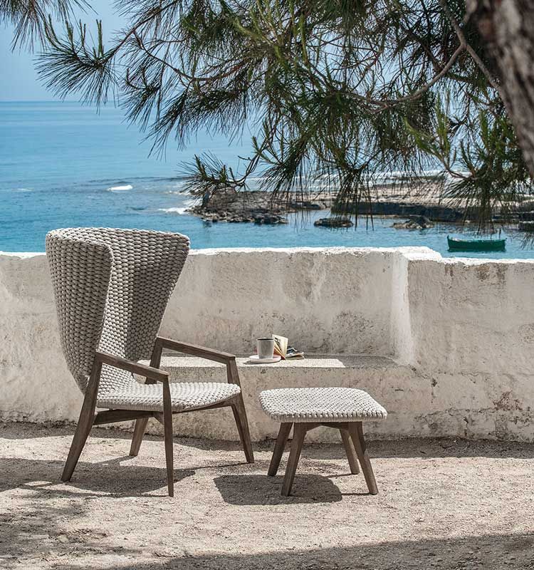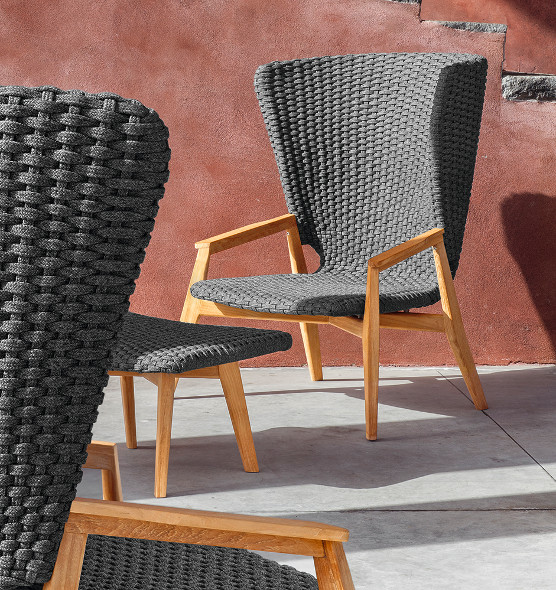Knit is a complete line of tables, chairs and lounge chairs in teak and woven rope that expresses with refinement a perfect synthesis of aesthetics, functionality and ergonomics. The iconic collection is enriched by the new version in pickled teak and light gray rope and the rocking version of the lounge chair with high back, thus offering a new and special interpretation of the classic bergère.